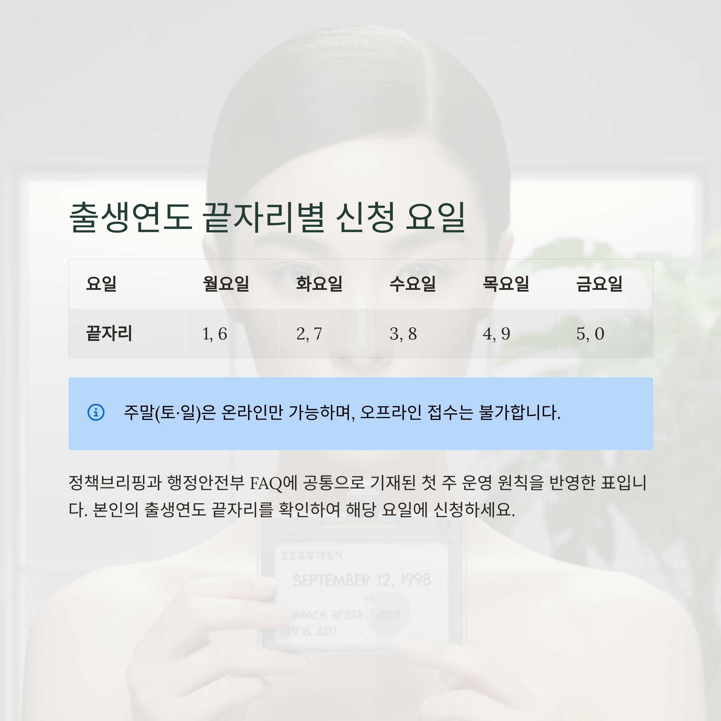 아래 표는 출생연도 끝자리에 따른 신청 요일을 정리한 것입니다.