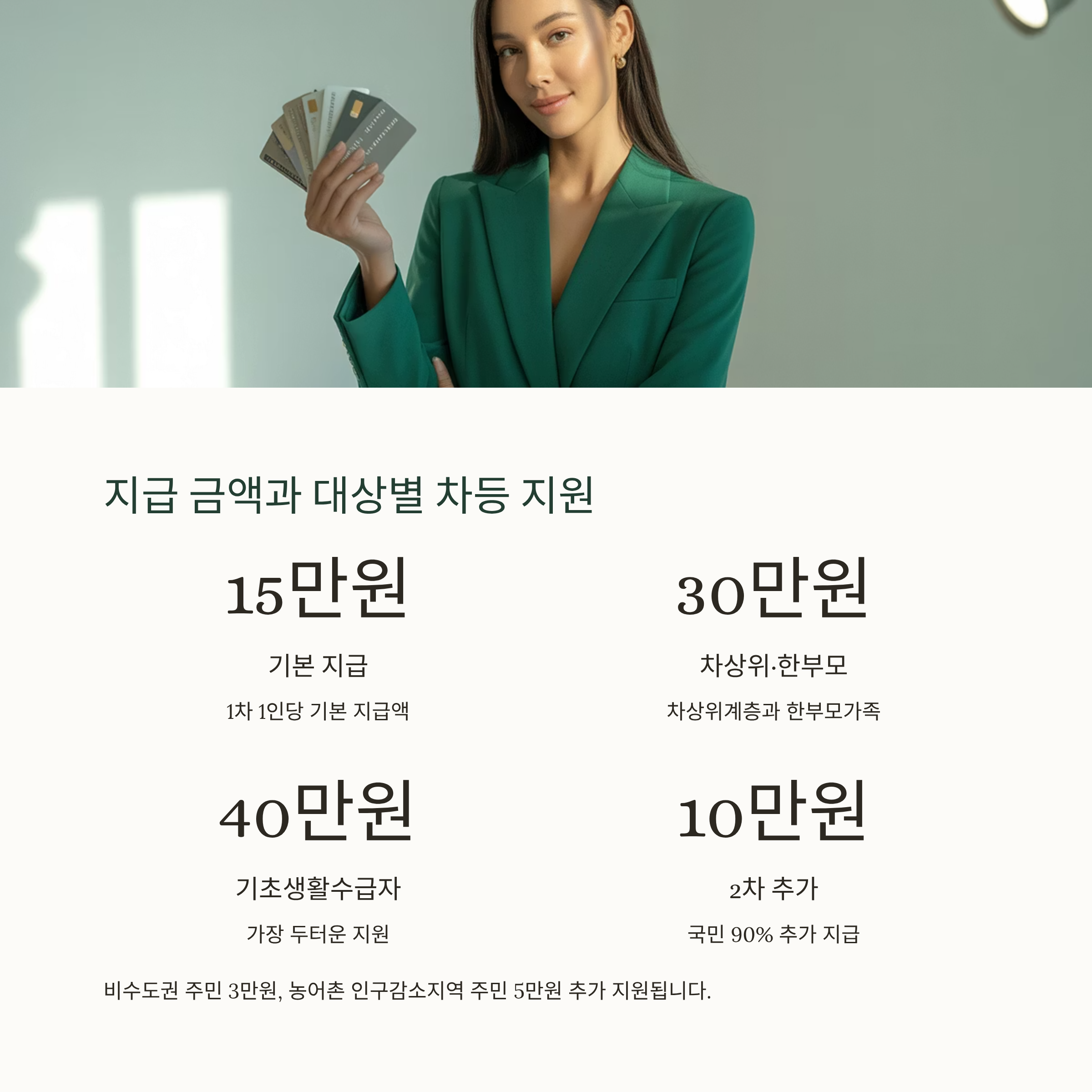 민생회복 소비쿠폰 요일제 기준은 접수 혼잡을 줄이기 위한 운영 원칙이며, 지급 금액 산정과는 별개입니다.  기본 지급은 1차에서 1인당 15만원이며, 차상위계층과 한부모가족은 30만원, 기초생활수급자는 40만원으로 두텁게 지원됩니다. 비수도권 주민에게는 3만원, 농어촌 인구감소지역 주민에게는 5만원이 추가로 안내되어 있습니다. 2차에서는 국민의 90퍼센트에게 1인당 10만원이 추가 지급되는 구조가 제시되어 있습니다.