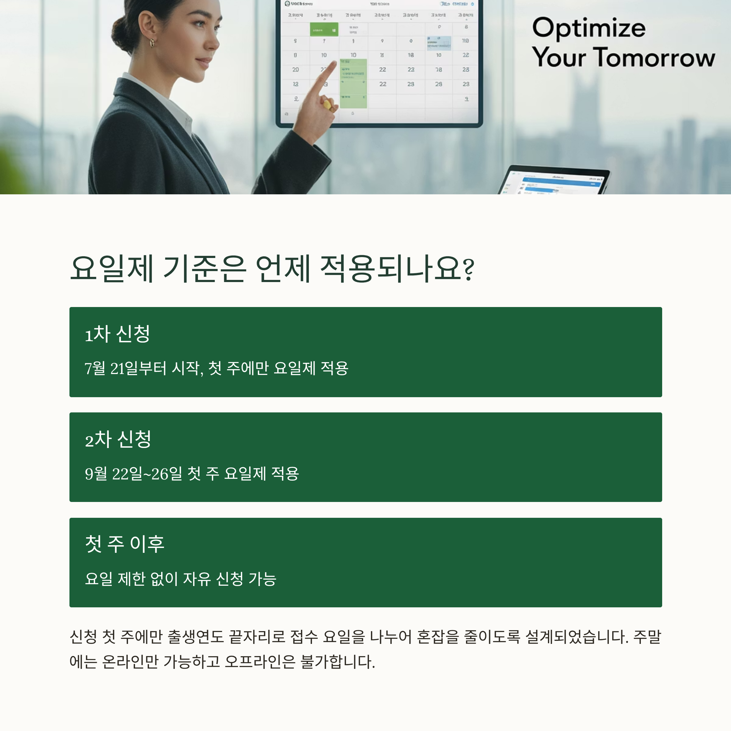 민생회복 소비쿠폰 요일제 기준은 2차 신청 첫 주인 9월 22일부터 26일까지 적용됩니다. 출생연도 끝자리를 기준으로 요일을 지정해 온라인과 오프라인 모두 분산 접수를 시행합니다.첫 주 이후에는 일반적으로 요일 제한 없이 신청이 가능하다는 점이 정부 안내에 명시되어 있습니다. 토요일과 일요일은 온라인 신청만 가능하고, 오프라인 접수는 첫 주 주말에 운영하지 않습니다.