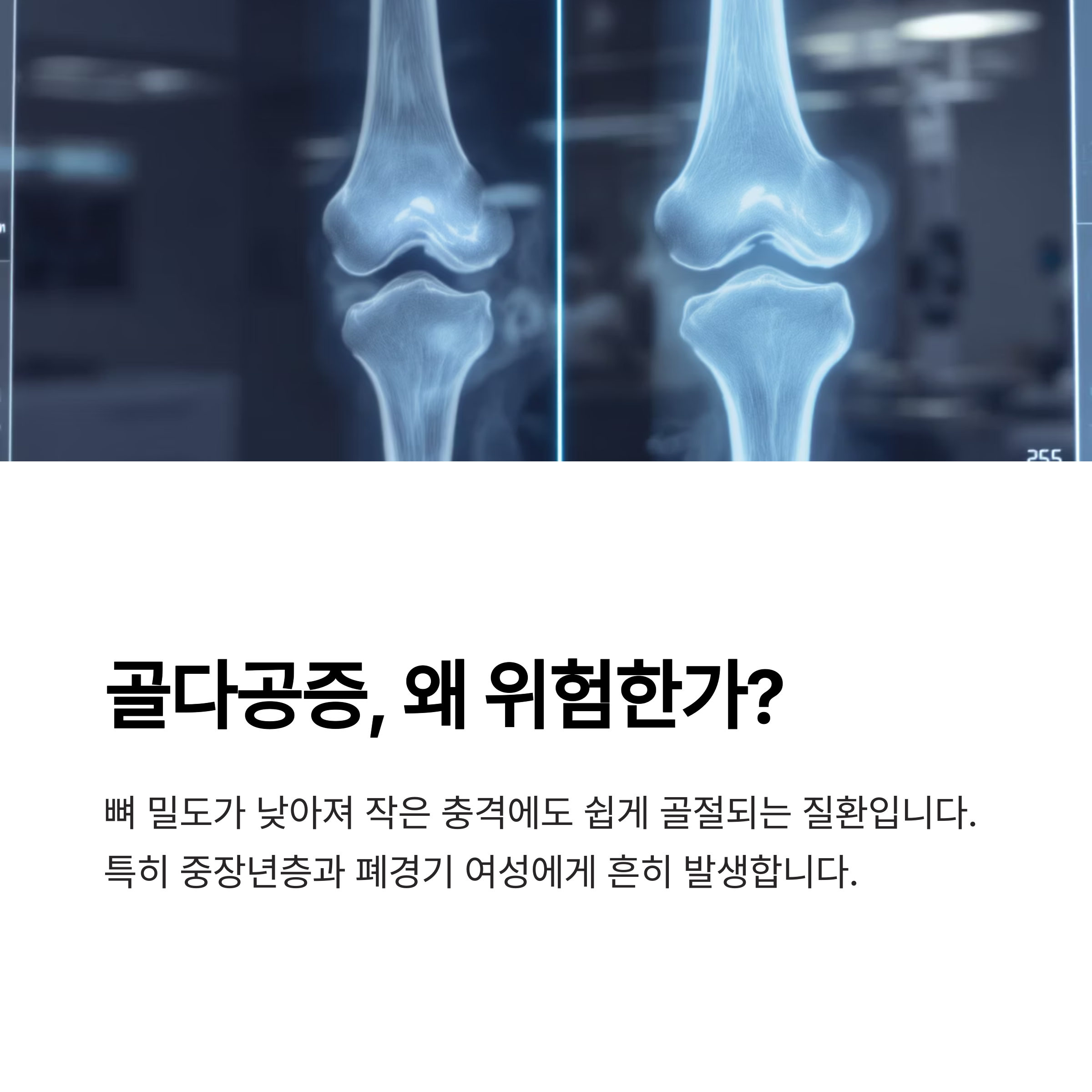 골다공증은 증상이 없다가 어느 날 갑작스럽게 나타나는 경우가 많습니다.