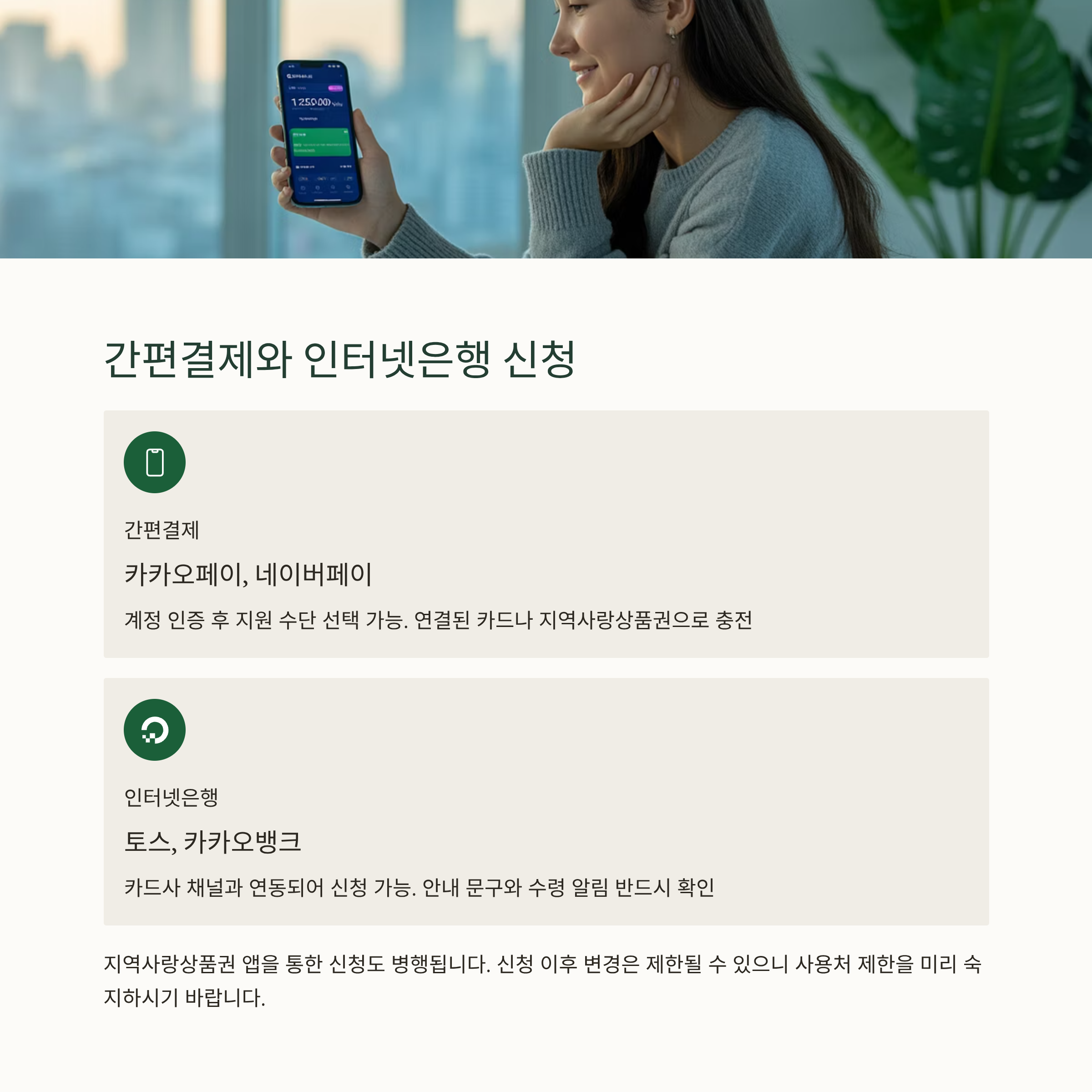간편결제에서 신청하는 경우 결제수단에 연결된 카드나 지역사랑상품권으로 충전됩니다. 안내 문구와 수령 알림을 반드시 확인하고 사용처 제한을 숙지하시기 바랍니다. 신청 이후 변경은 제한될 수 있습니다.
