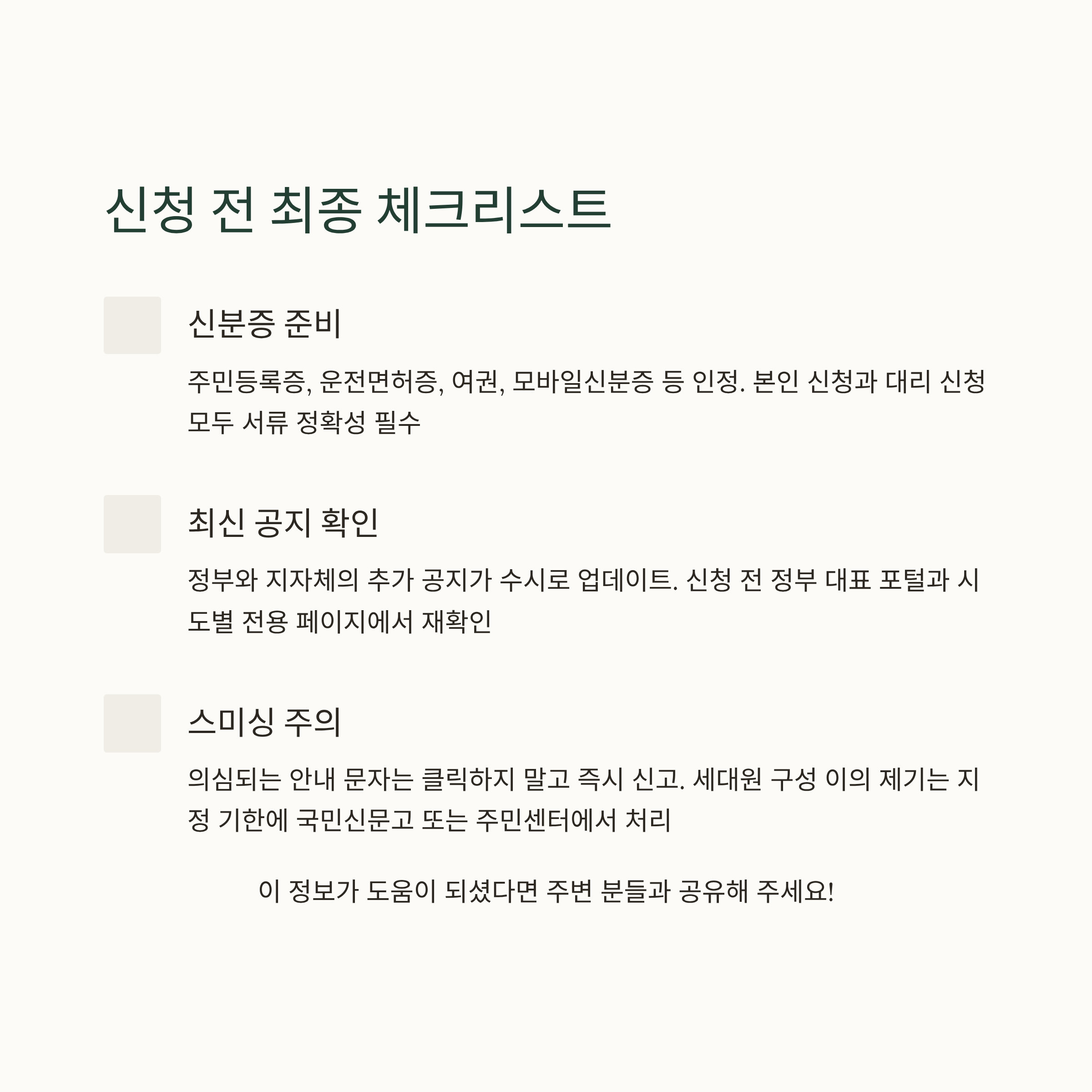 신분증 종류는 주민등록증 운전면허증 여권 모바일신분증 등으로 인정됩니다. 본인 신청과 대리 신청 모두 서류가 정확해야 접수가 가능합니다. 세대원 구성과 가구 판정 이의 제기는 지정 기한에 국민신문고 또는 주민센터에서 처리합니다. 스미싱이 의심되는 안내 문자는 클릭하지 마시고 즉시 신고하십시오.