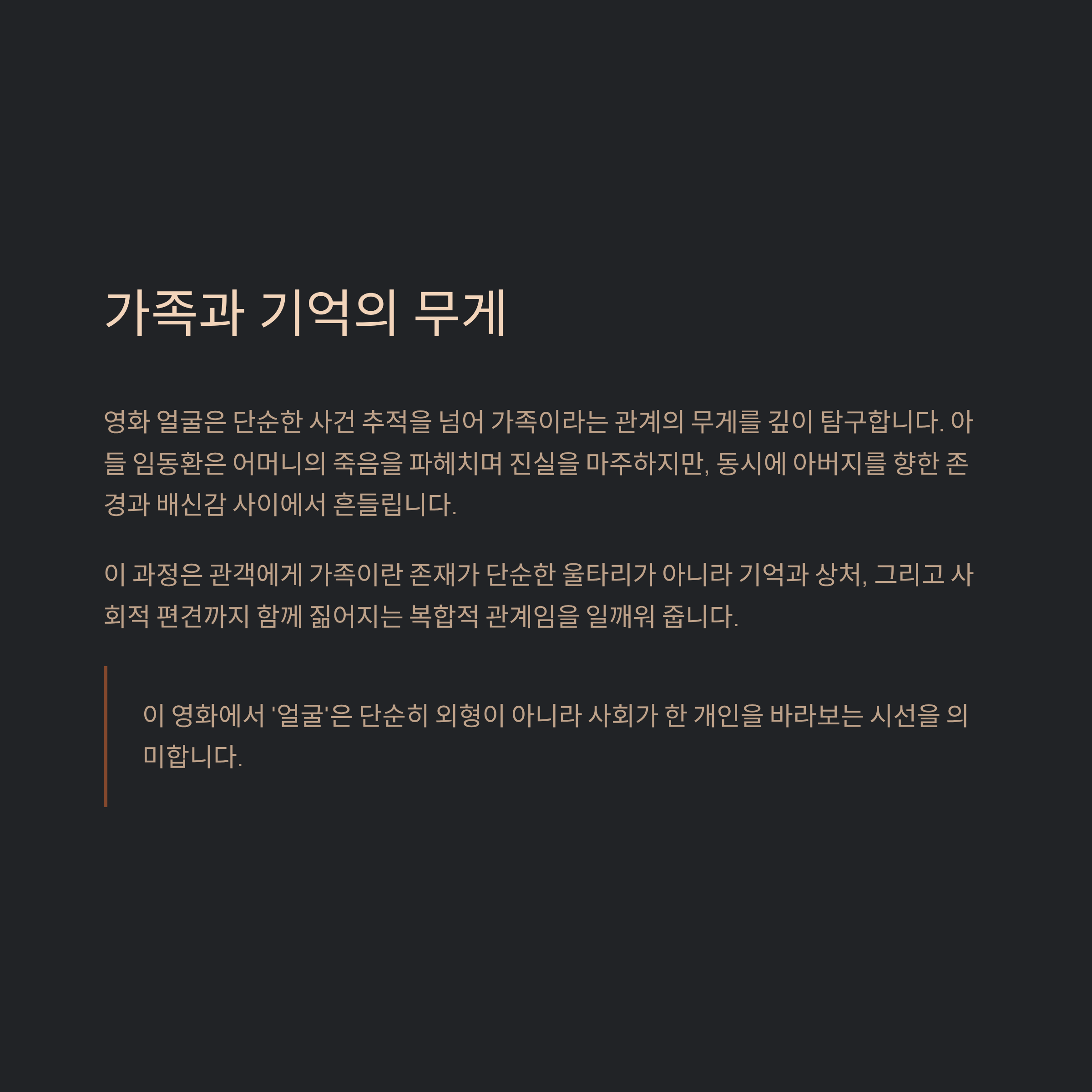 영화 얼굴은 단순한 사건 추적을 넘어 가족이라는 관계의 무게를 깊이 탐구합니다. 아들 임동환은 어머니의 죽음을 파헤치며 진실을 마주하지만, 동시에 아버지를 향한 존경과 배신감 사이에서 흔들립니다. 이 과정은 관객에게 가족이란 존재가 단순한 울타리가 아니라 기억과 상처, 그리고 사회적 편견까지 함께 짊어지는 복합적 관계임을 일깨워 줍니다.