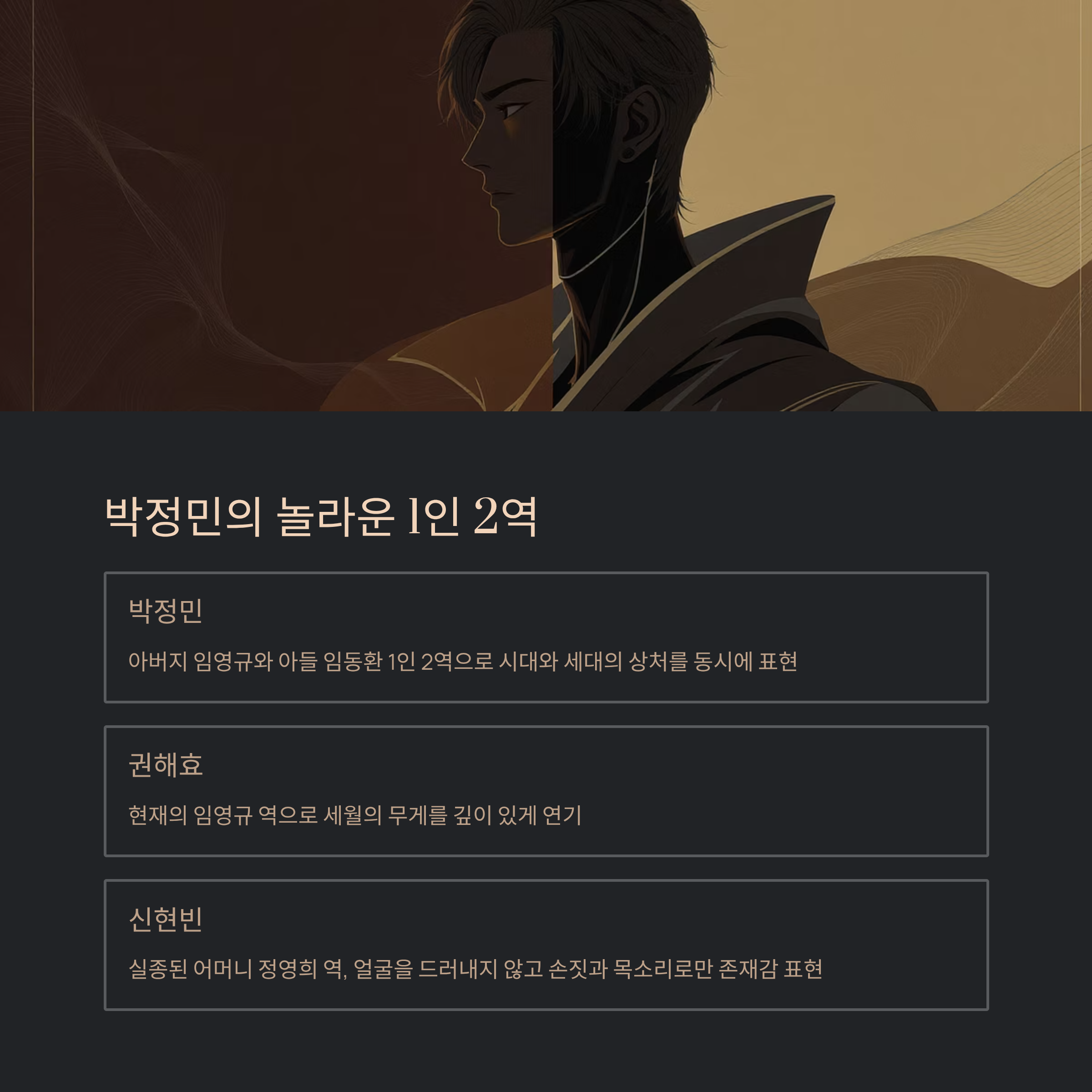 이번 영화의 가장 큰 화제는 배우 박정민입니다. 그는 아버지 임영규와 아들 임동환, 두 인물을 동시에 연기하며 시대와 세대의 상처를 동시에 표현합니다. 권해효는 현재의 임영규를 연기하며 세월의 무게를 드러내고, 신현빈은 실종된 어머니 정영희 역으로 등장하지만 얼굴을 온전히 드러내지 않고 손짓과 목소리로 존재감을 남깁니다.