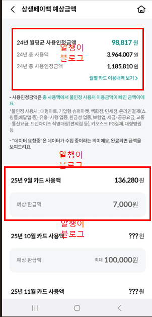 상생페이백 누리집에서 접수 후 예상 환급액을 조회할 수 있습니다. 카드사 앱 마이데이터 서비스와도 연동되어 있어, 본인 소비 실적과 전년도 대비 증가액을 확인 가능합니다. 확정 금액은 정부 시스템 기준으로 산정되며 매월 지급일에 맞춰 제공됩니다.