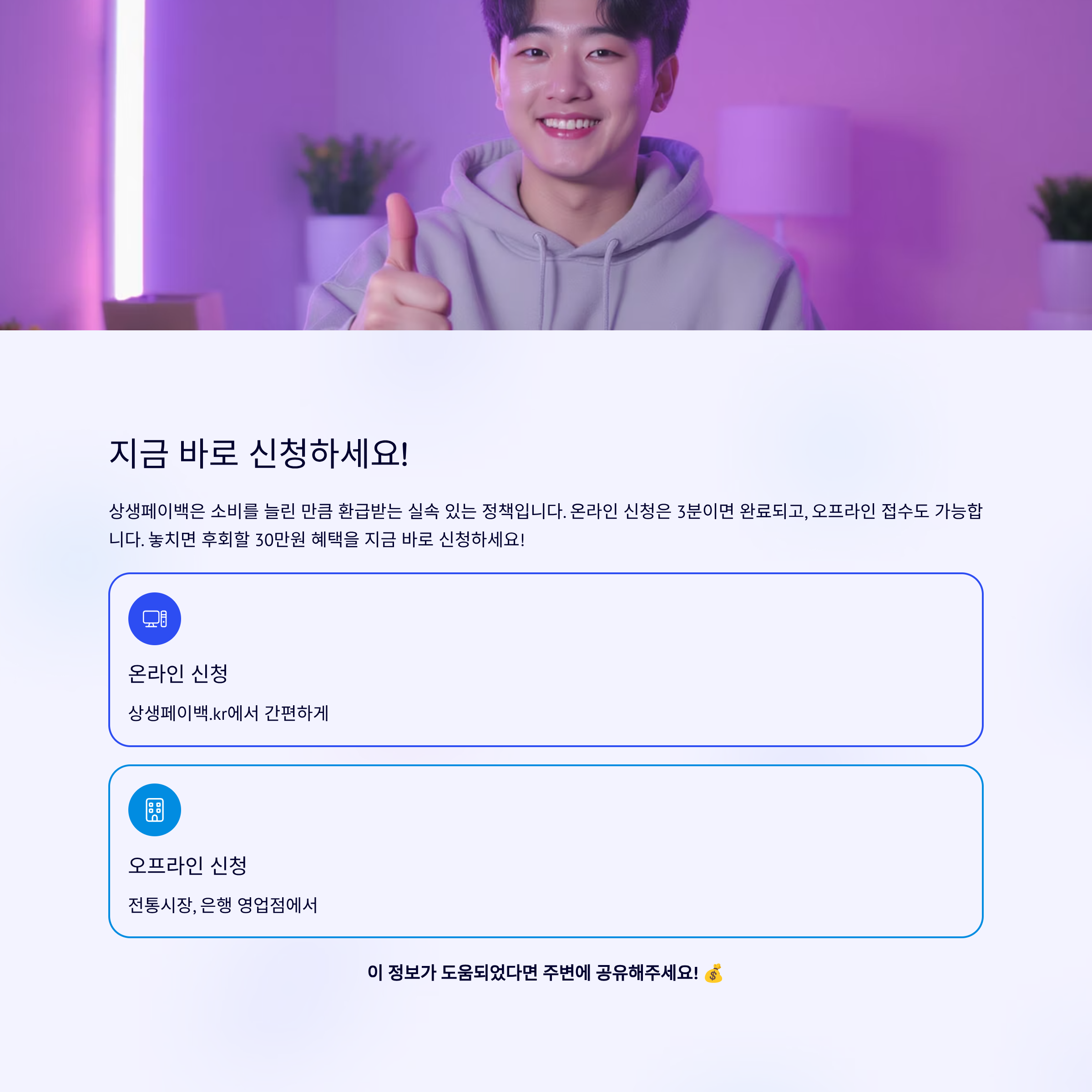 신청은 온라인과 오프라인 모두 가능합니다. 온라인은 공식 누리집(상생페이백.kr)에서 본인 인증 후 카드 정보 연동만 하면 3분 안에 완료됩니다. 오프라인은 전통시장 상인회, 소상공인지원센터, 주요 은행 영업점 등에서 접수 가능합니다.
