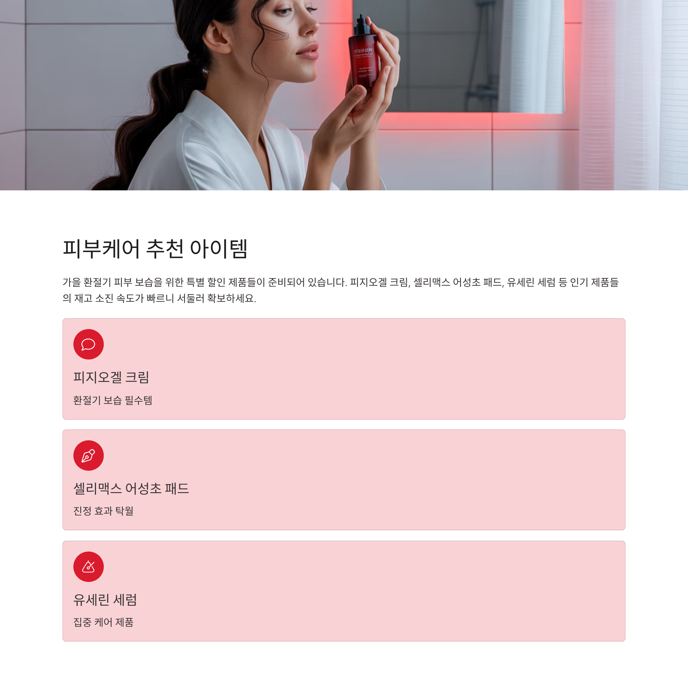 가을 환절기 피부 보습을 위한 피지오겔 크림, 셀리맥스 어성초 패드, 유세린 세럼 등이 할인 품목에 포함돼 있습니다. 인기 제품 특성상 재고 소진 속도가 빠르므로, 이번 주는 미리 확보하는 것이 현명한 선택이 됩니다.