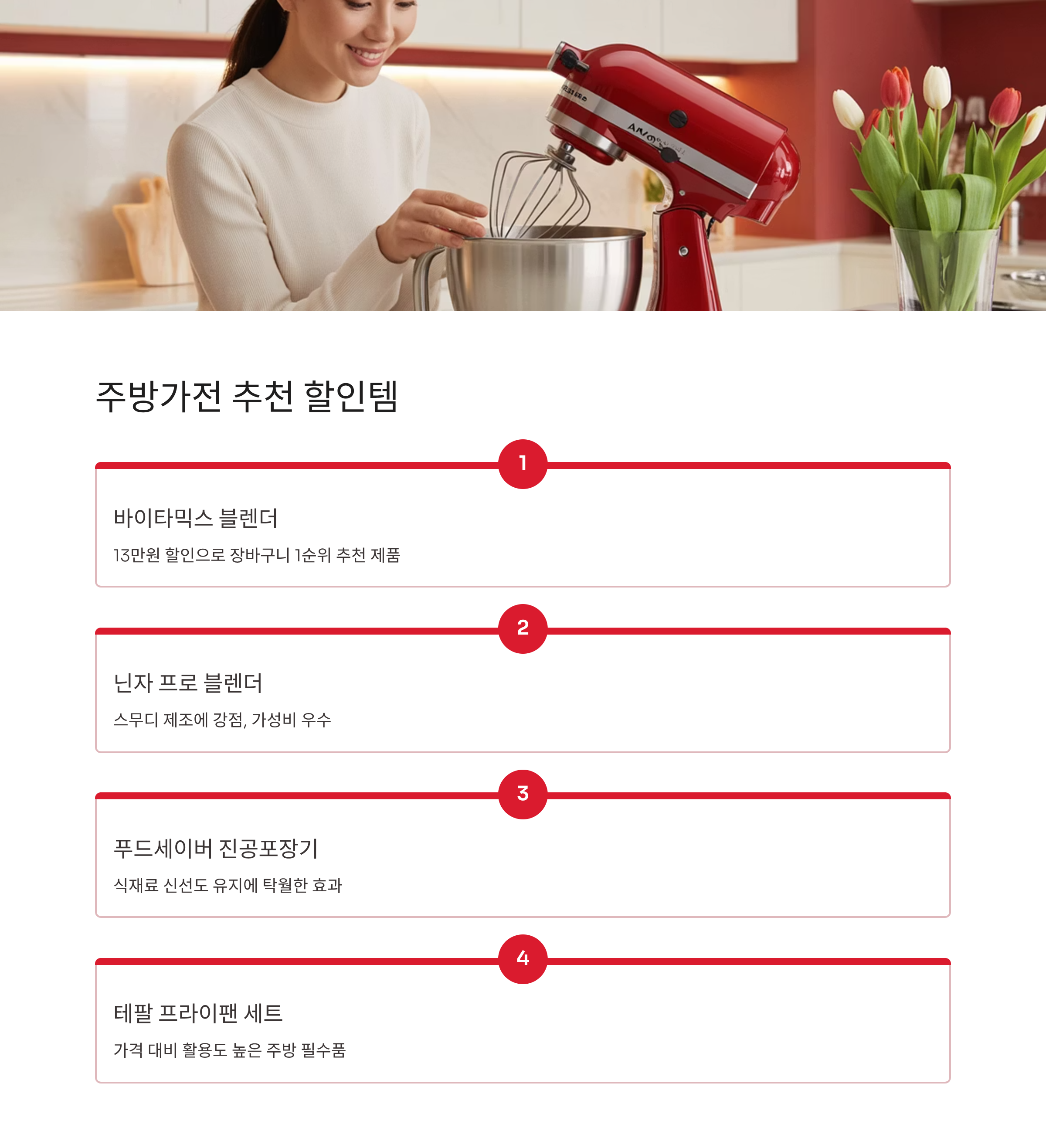 바이타믹스 블렌더는 13만 원 할인돼 장바구니 1순위로 꼽히고 있습니다. 닌자 프로 블렌더 역시 스무디 제조에 강점이 있으며, 푸드세이버 진공포장기는 식재료 신선도 유지에 도움을 줍니다. 테팔 프라이팬 세트와 도루코 주방가위 세트는 가격 대비 활용도가 높은 제품입니다.
