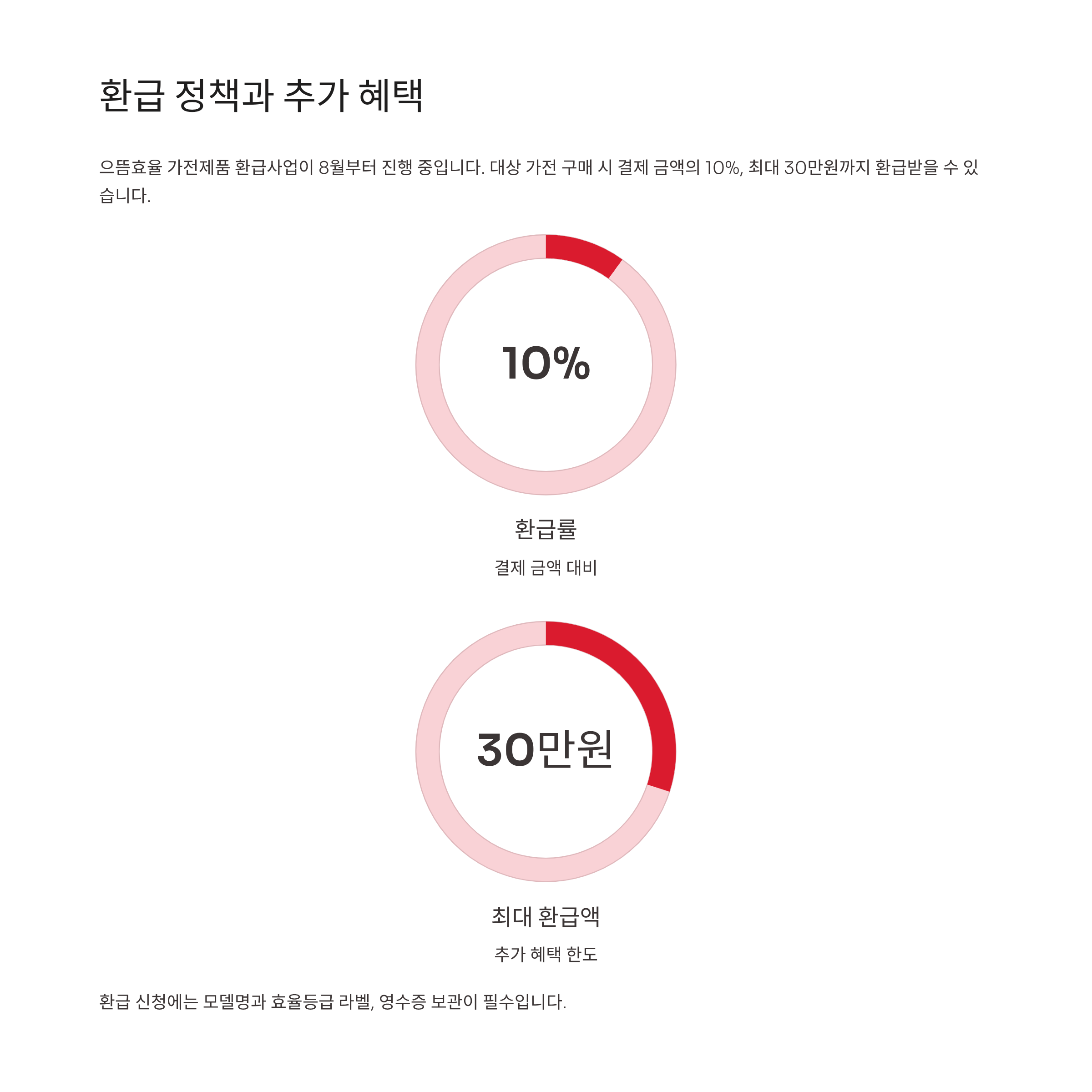 으뜸효율 가전제품 환급사업이 올해 8월부터 진행 중이며, 대상 가전을 구매할 경우 결제 금액의 10퍼센트, 최대 30만 원까지 환급됩니다. 환급 신청에는 모델명과 효율등급 라벨, 영수증 보관이 필수입니다. 이번 주 할인 품목 중 고효율 제품을 선택하면 실질 체감가를 더 낮출 수 있습니다.