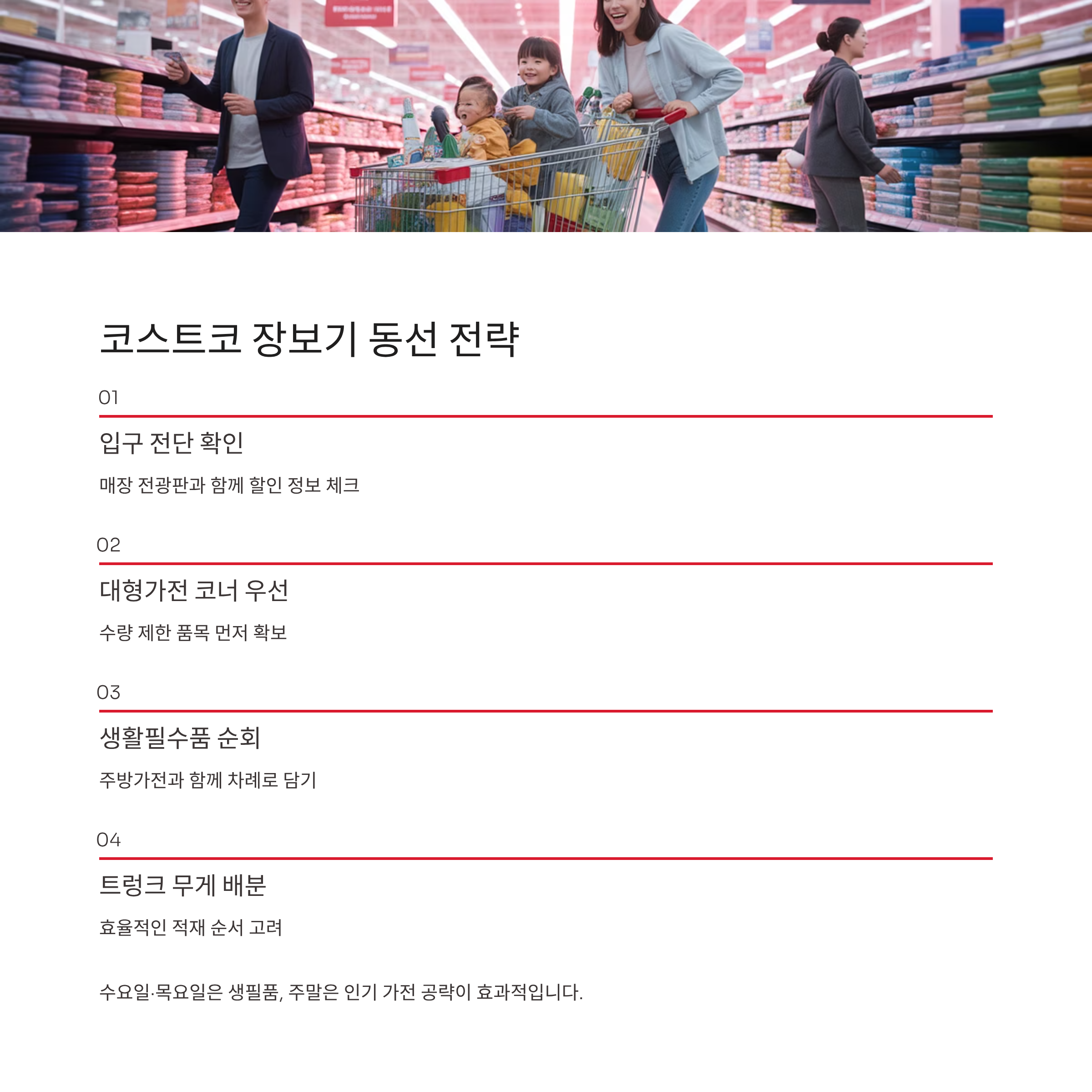 입구 전단과 매장 전광판을 확인한 뒤 대형가전 코너를 먼저 도는 것이 효율적입니다. 이후 생활필수품과 주방가전을 차례로 담으면 트렁크에 무게 배분이 쉽습니다. 요일별로 재고 보충 시점이 달라 수요일과 목요일은 생필품, 주말은 인기 가전을 공략하는 것이 좋습니다.