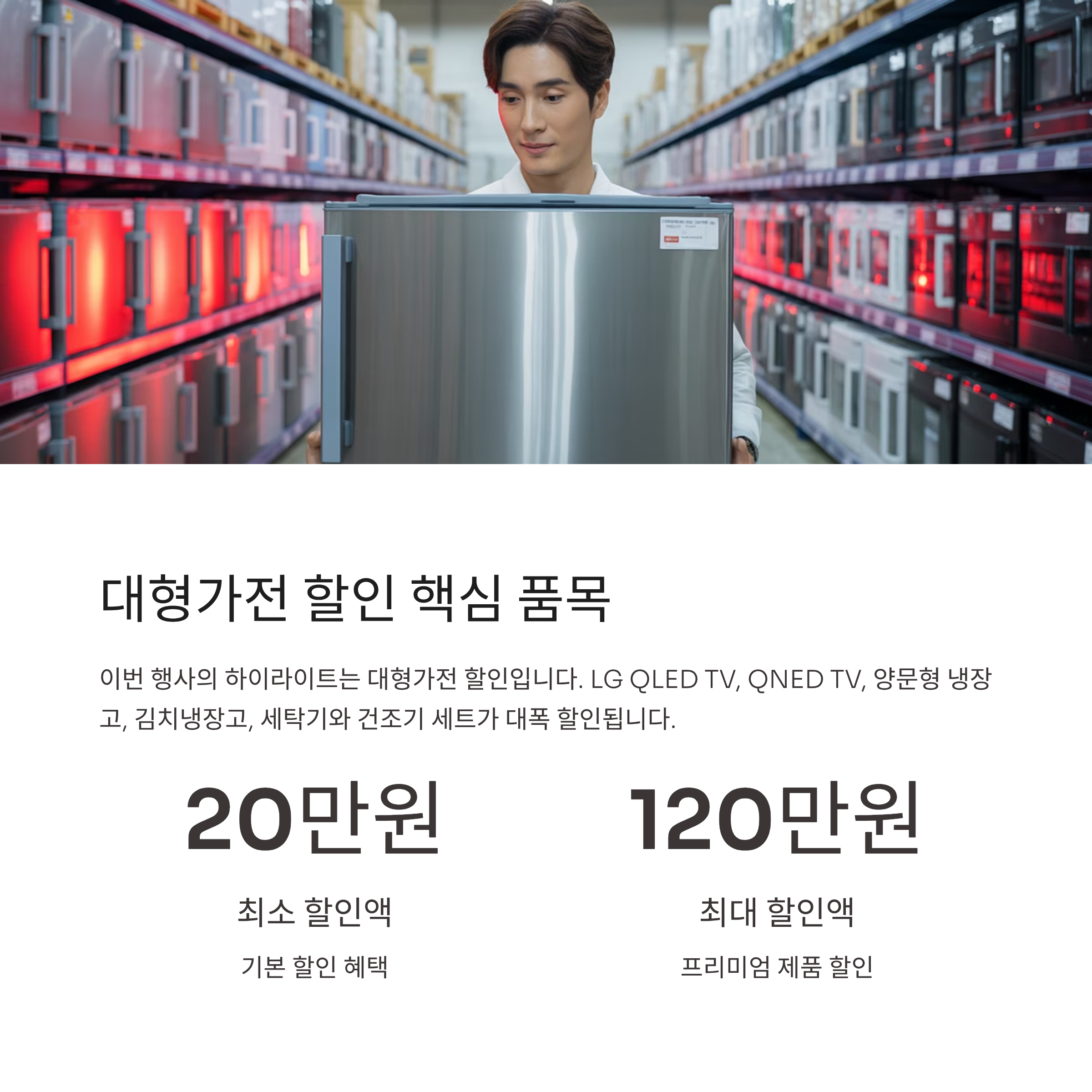 이번 행사에서는 LG QLED TV, QNED TV, 양문형 냉장고, 김치냉장고, 세탁기와 건조기 세트가 대폭 할인됩니다. 할인 폭이 20만 원에서 최대 120만 원까지 적용돼 실질 체감가가 확 낮아집니다. 환급 정책을 함께 고려하면 더 합리적인 선택이 됩니다.
