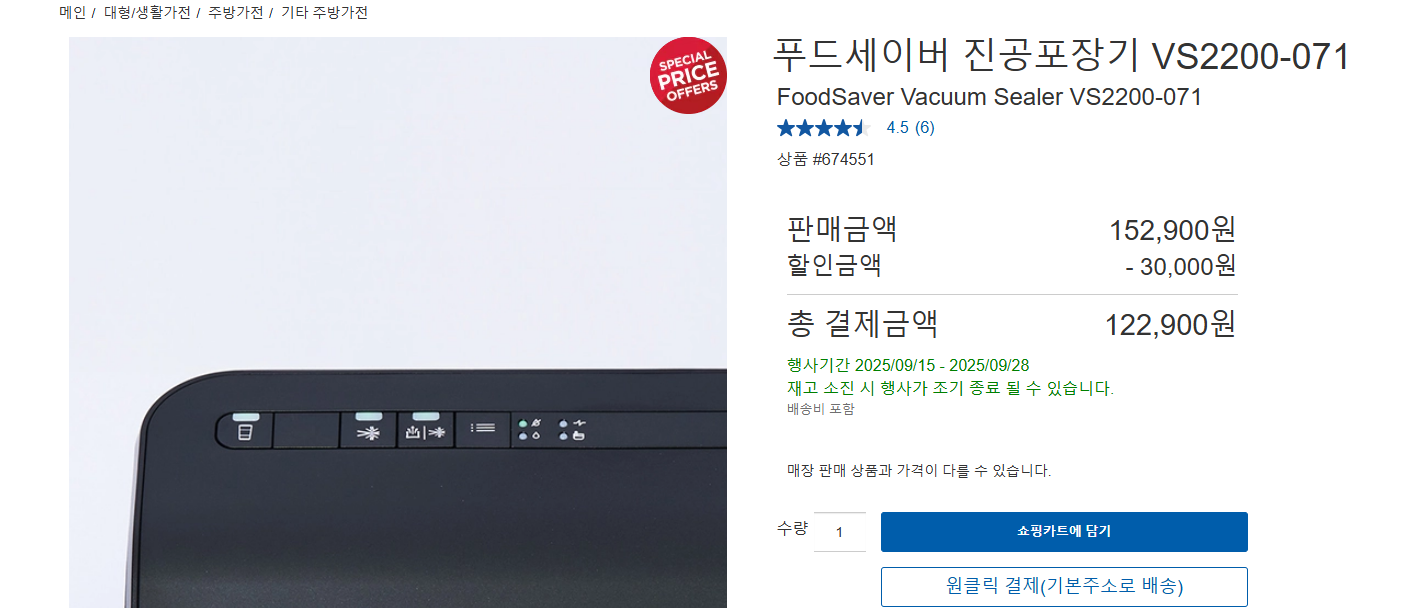 | 푸드세이버 진공포장기 | 122,900원 | 30,000원 | 냉동 보관 |