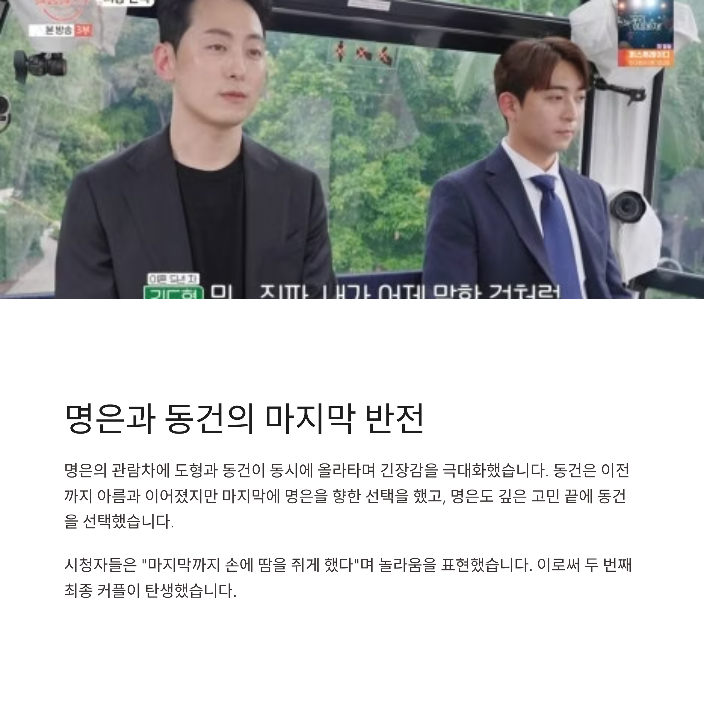 명은의 관람차에는 도형과 동건이 동시에 올라타며 긴장감을 극대화했습니다. 동건은 이전까지 아름과 이어졌지만, 마지막에 명은을 향한 선택을 했습니다. 명은은 깊은 고민 끝에 동건을 선택했고, 이로써 두 번째 최종 커플이 탄생했습니다. 시청자들은 “마지막까지 손에 땀을 쥐게 했다”며 놀라움을 표현했습니다.
