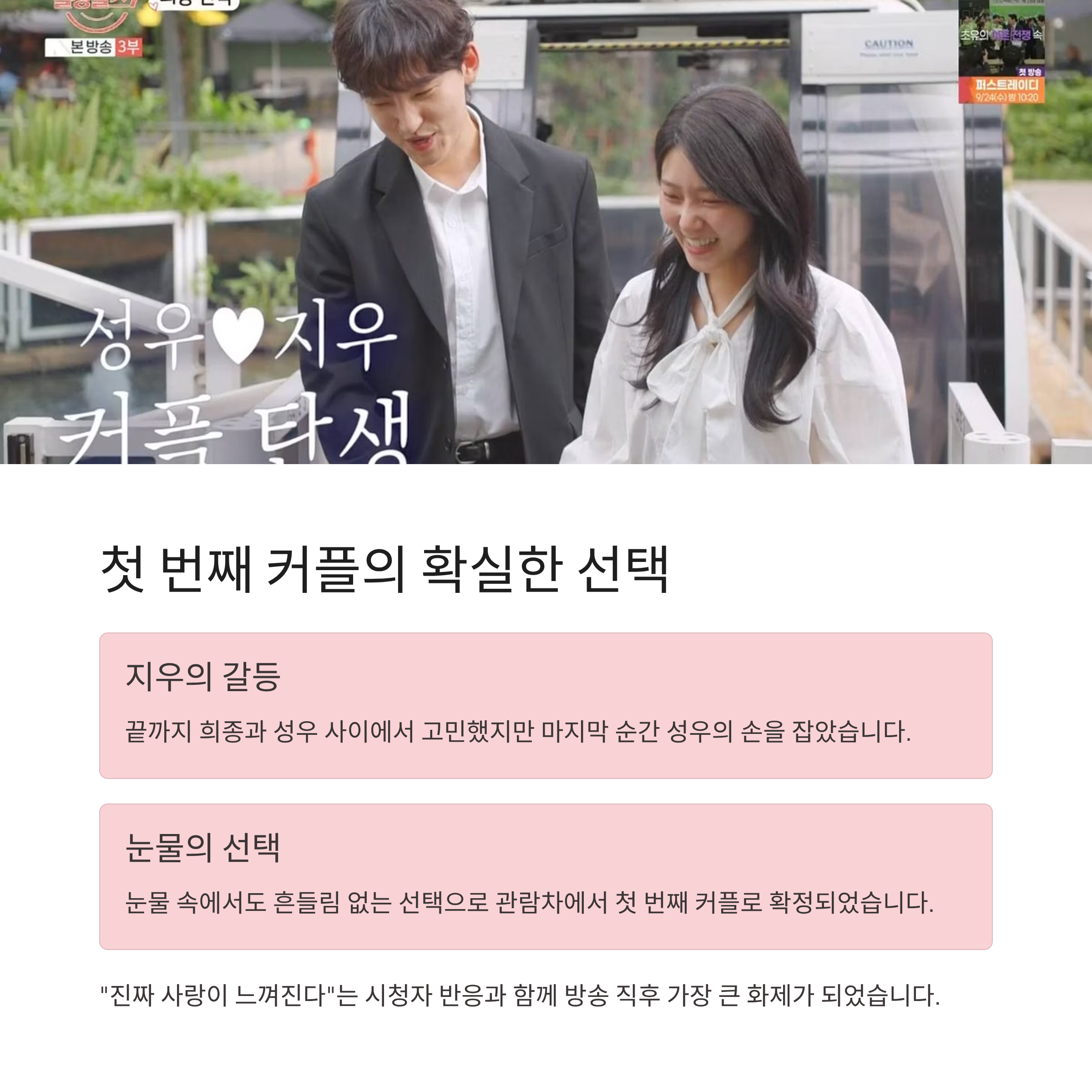 지우는 끝까지 희종과 성우 사이에서 갈등했지만 최종 순간 성우의 손을 잡았습니다. 눈물 속에서도 흔들림 없는 선택이었고, 두 사람은 관람차에서 내려 첫 번째 최종 커플로 확정되었습니다. 이 장면은 “진짜 사랑이 느껴진다”는 반응을 얻으며 방송 직후 가장 큰 화제가 되었습니다.