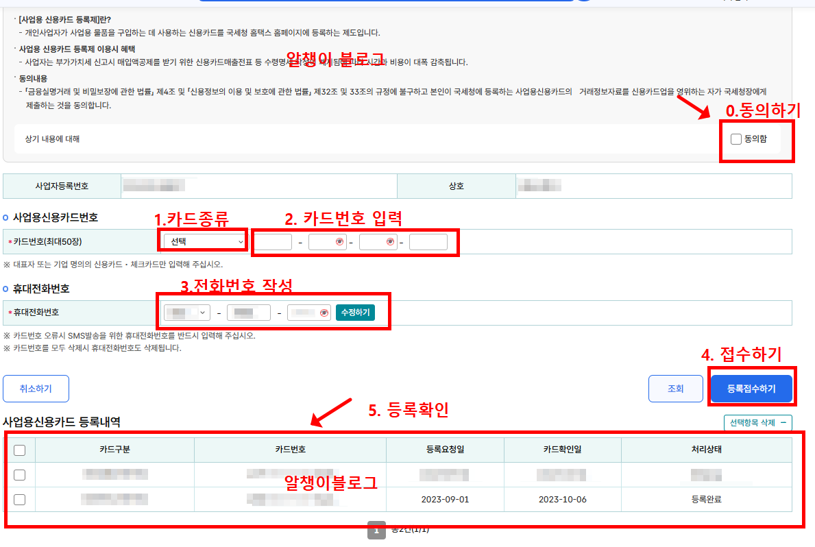 모든 정보를 입력한 후 등록 접수하기 버튼을 눌러야 합니다. 접수 완료 후 국세청에서 카드사 정보를 확인하는 과정이 진행되며, 승인까지는 일정 기간이 소요될 수 있습니다.