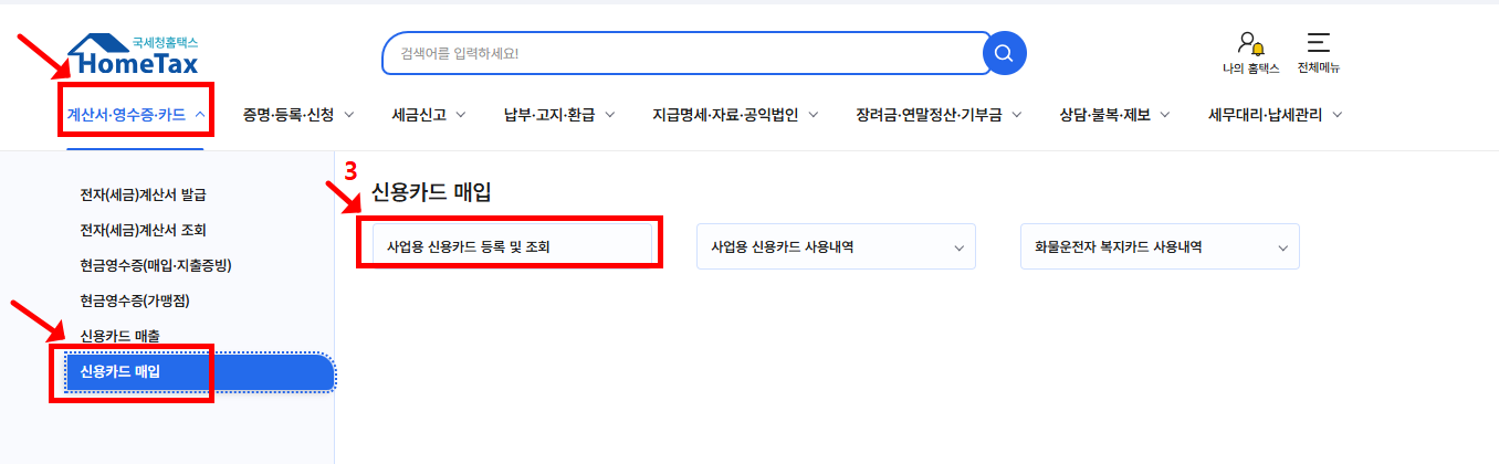 좌측 사이드 메뉴에서 신용카드 매입 항목을 클릭합니다. 이후 화면 중앙에서 사업용 신용카드 등록 및 조회 항목을 선택하면 등록 화면으로 이동할 수 있습니다.