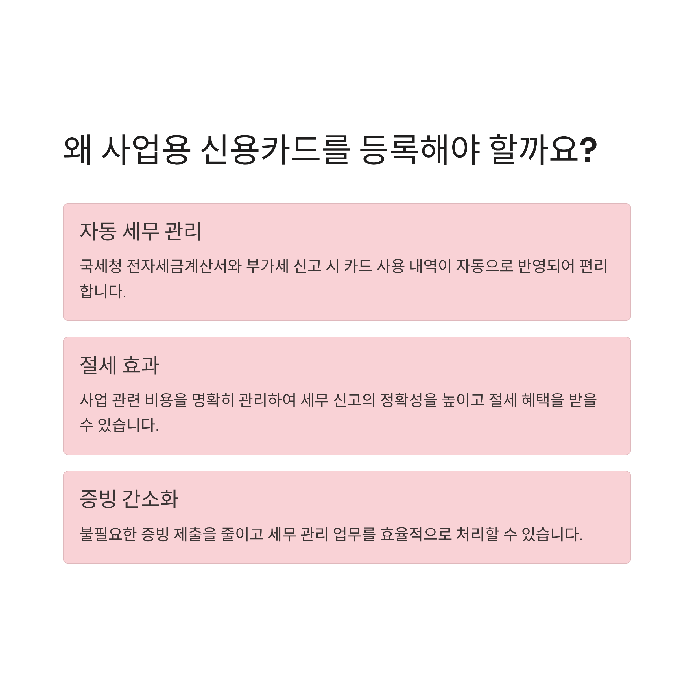 카드를 등록하면 매입 자료가 국세청에 자동 집계되어 세무 신고 정확성이 크게 향상됩니다. 특히 부가가치세 신고 기간에 불필요한 오류를 줄일 수 있어 편리합니다. 이러한 장점 때문에 국세청도 사업용 신용카드 등록을 적극 권장하고 있습니다.
