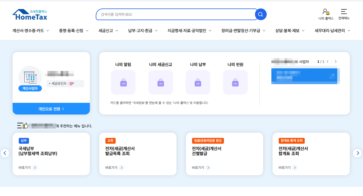 1단계 | 홈텍스 로그인 후 메인 화면 진입 |