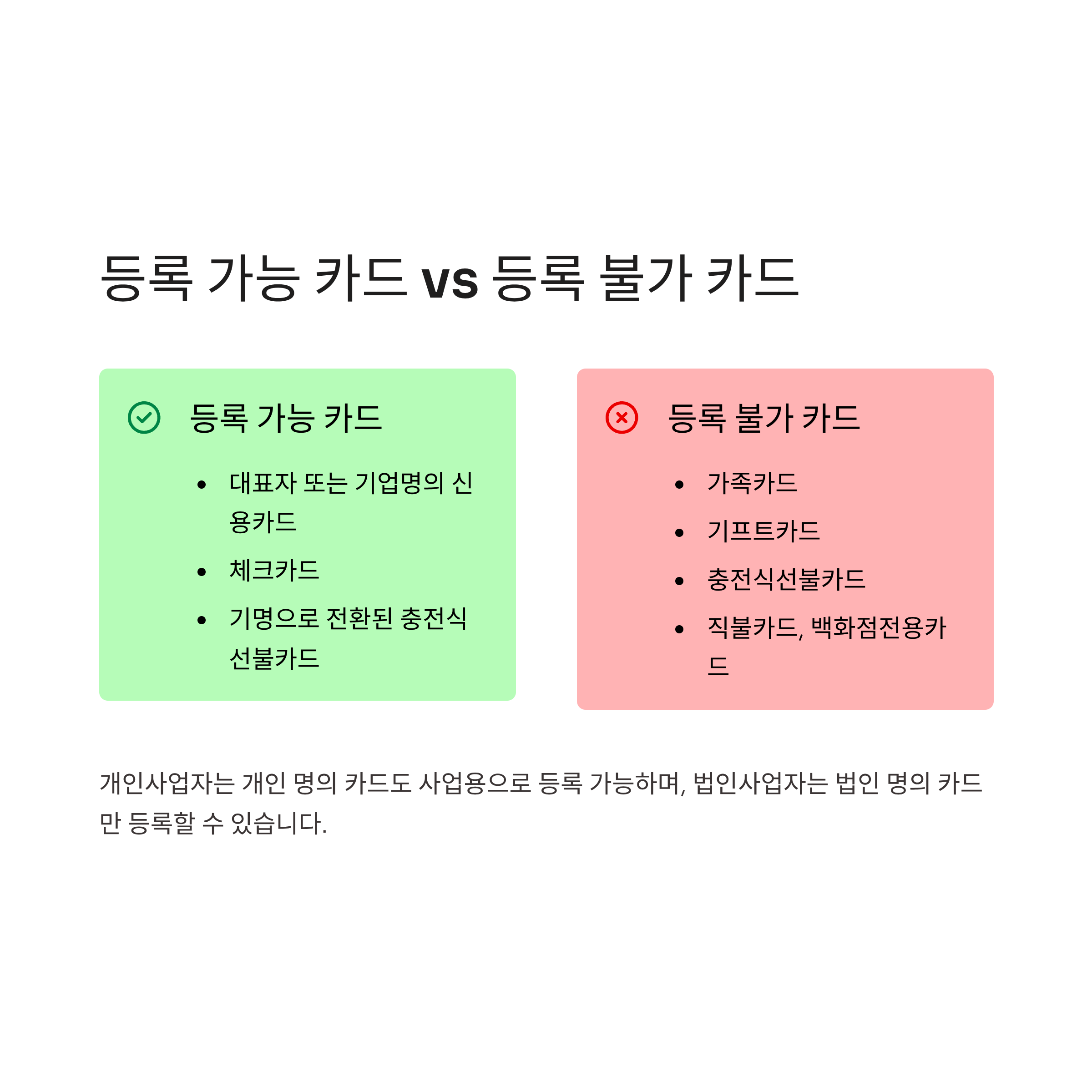 - 등록가능 카드 : 대표자 또는 기업명의의 신용카드, 체크카드, 기명으로 전환된 충전식 선불카드(기프트 카드만 해당)