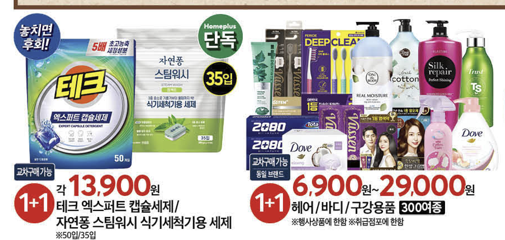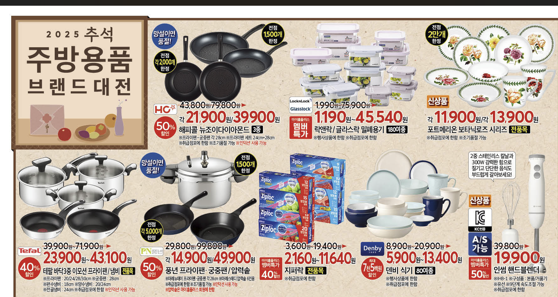 주방용품 브랜드전에서는 후라이팬, 냄비, 밀폐용기 등이 대폭 할인된 가격에 제공됩니다. 또한 세제, 바디케어, 생활 필수품도 1+1, 2+1 행사로 마련되어 있어 실속 있게 준비할 수 있습니다.