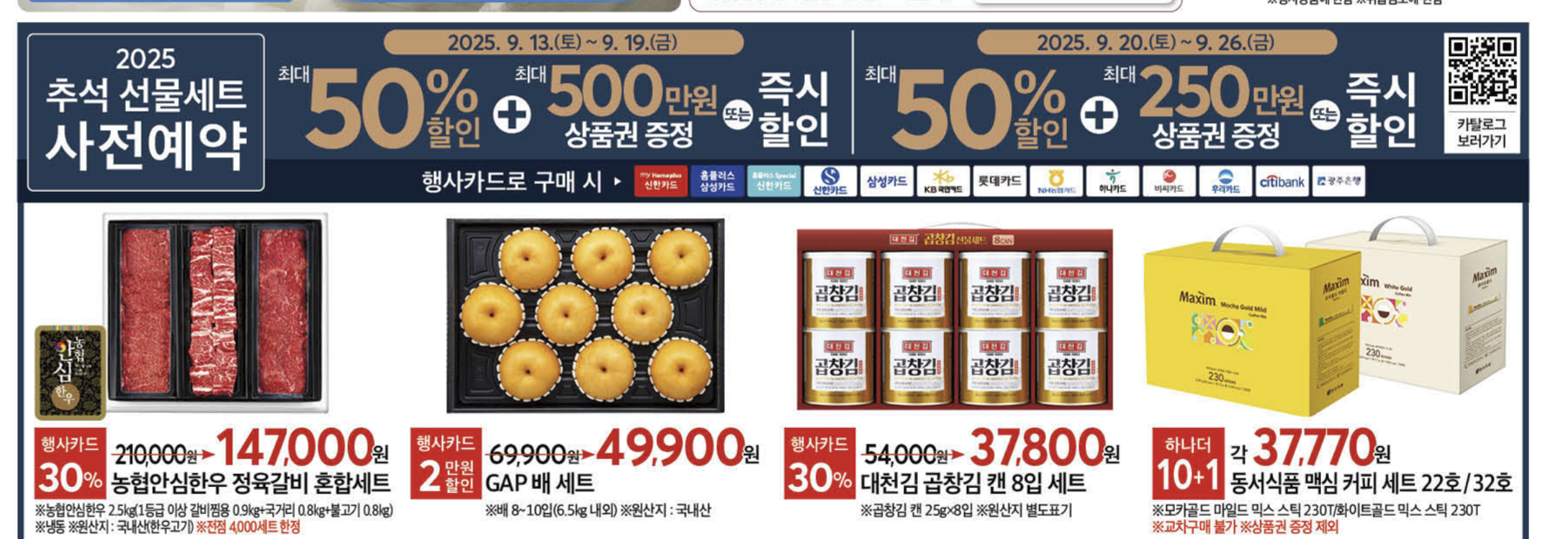 추석을 앞두고 선물세트를 미리 예약하면 최대 50% 할인 혜택을 받을 수 있습니다. 한우 세트, 사과 배 세트, 홍삼 제품 등이 행사 품목에 포함되어 있으며, 예약 시 추가 상품권 증정 혜택도 함께 제공됩니다.