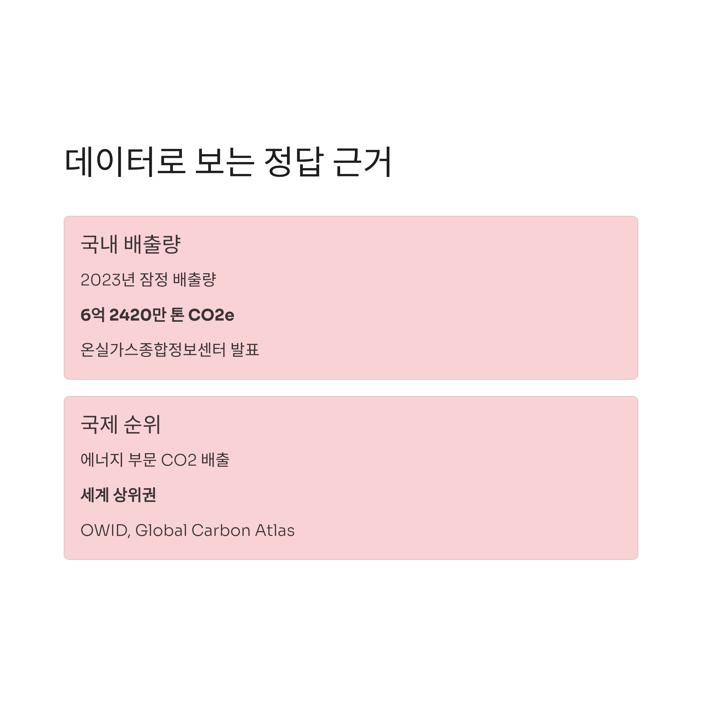 국제 비교 지표에서 한국은 에너지 부문 이산화탄소 배출 기준 상위권으로 집계됩니다. 또한 국내 온실가스종합정보센터는 2023년 국가 온실가스 잠정 배출량을 6억 2420만 톤으로 발표했습니다. 이 수치는 세계 최저 수준과는 명백히 다릅니다.