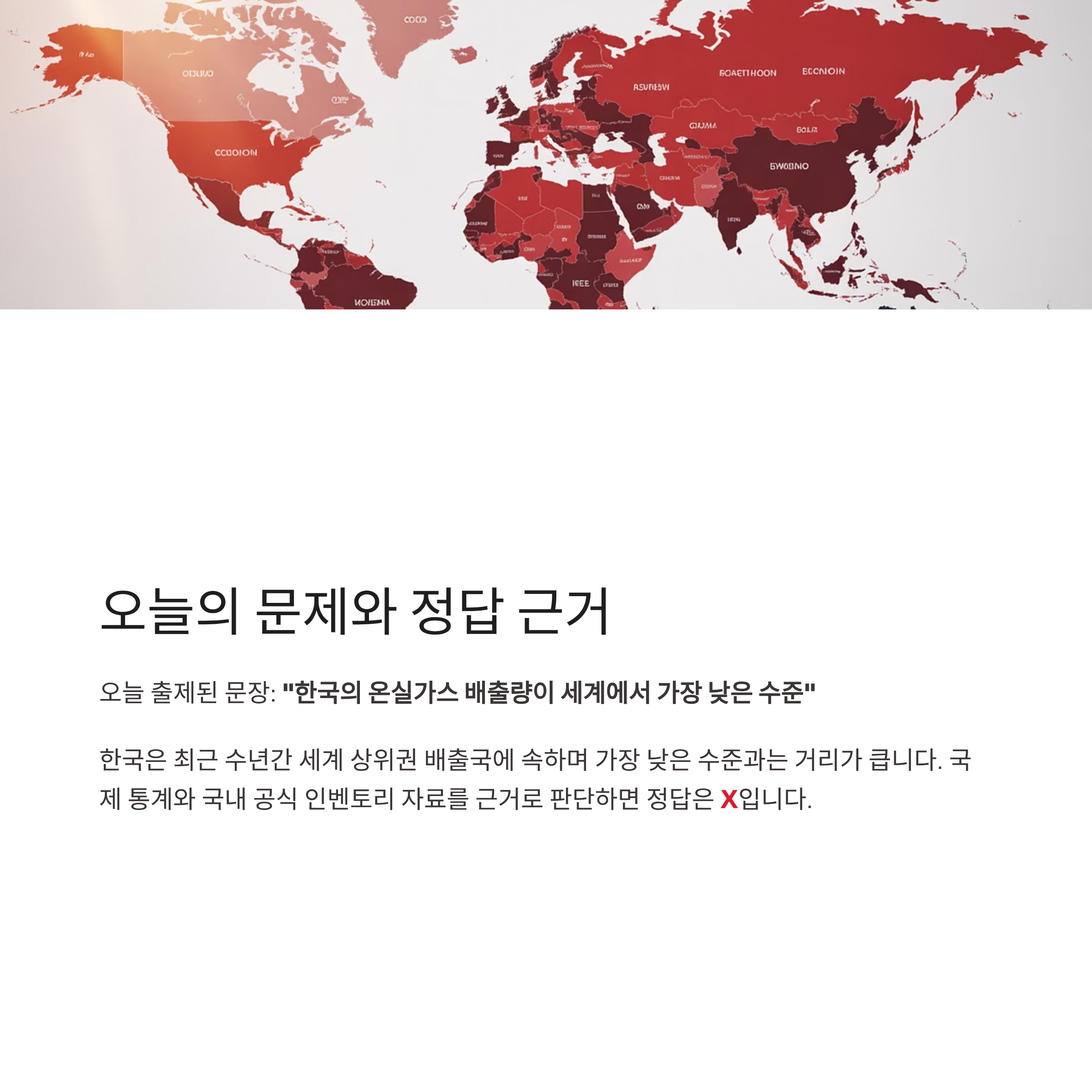 오늘 출제 문장으로 널리 공유된 내용은 한국의 온실가스 배출량이 세계에서 가장 낮은 수준이라는 진술입니다.