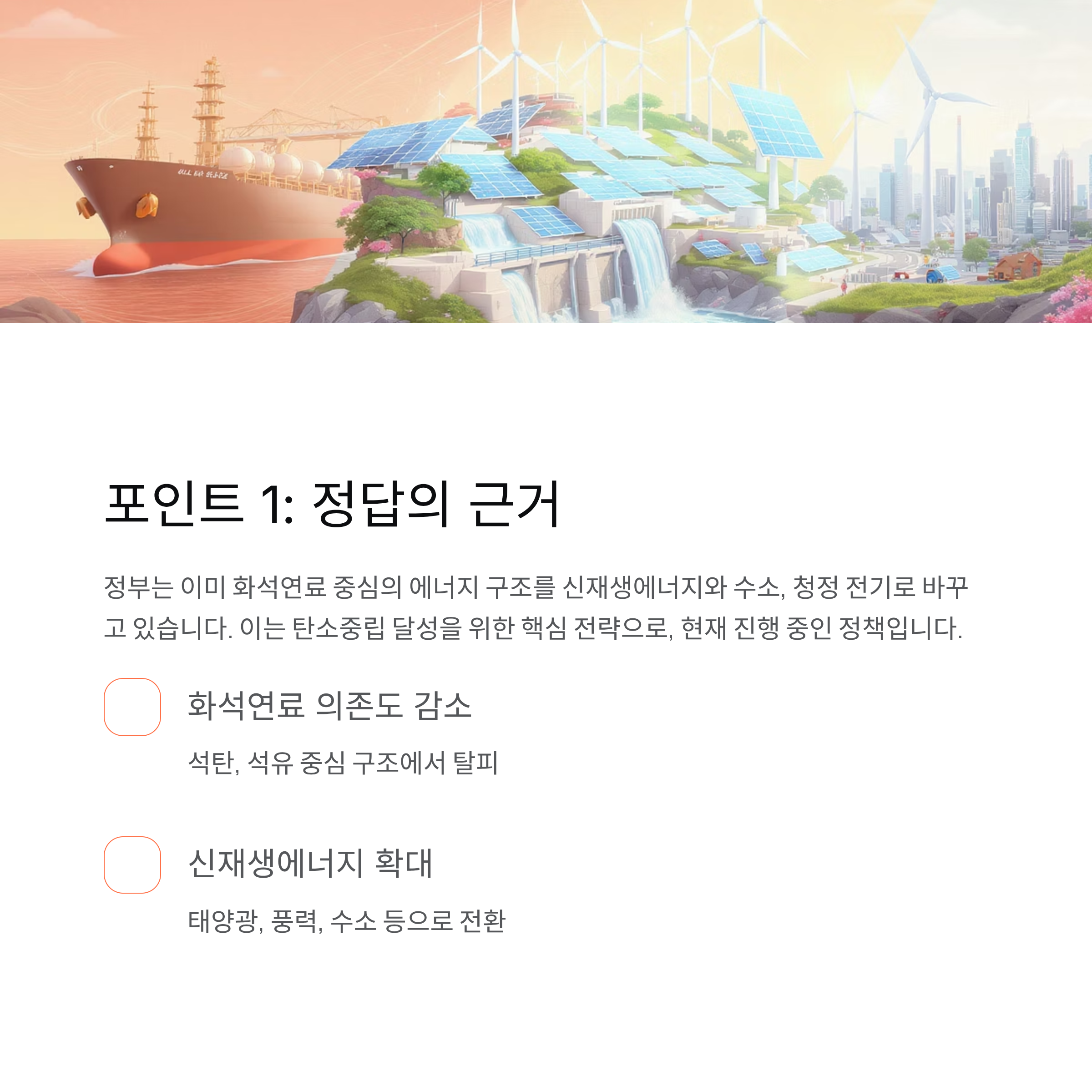 이번 퀴즈의 정답은 "그렇다"입니다. 정부는 이미 화석연료 중심의 에너지 구조를 신재생에너지와 수소, 청정 전기로 바꾸고 있습니다.