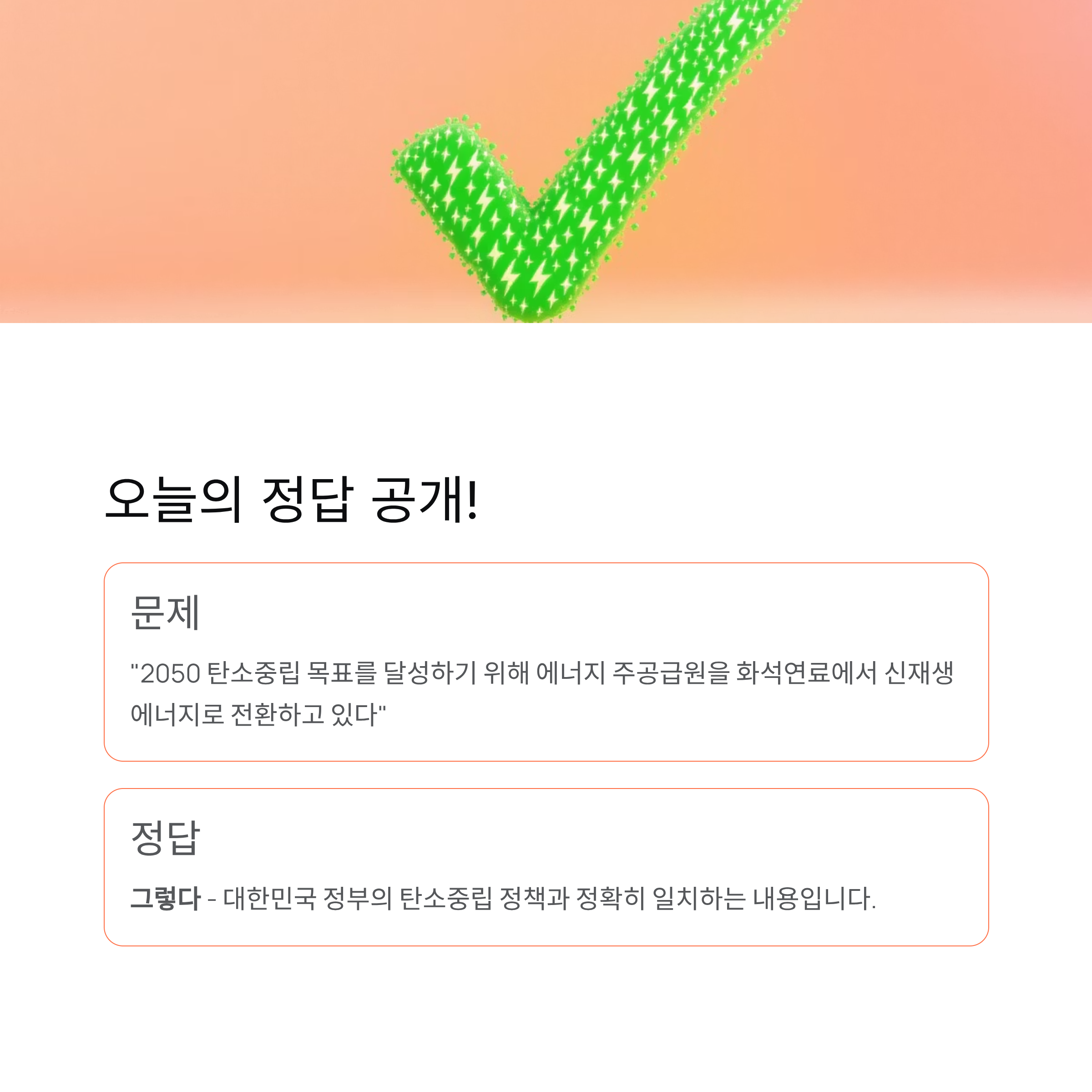 오늘 퀴즈는 단순한 OX 문제가 아니라, 우리 사회가 반드시 가야 할 길을 알려줍니다. 신재생에너지 전환은 선택이 아닌 필수이며, 이는 미래 세대를 위한 준비입니다.