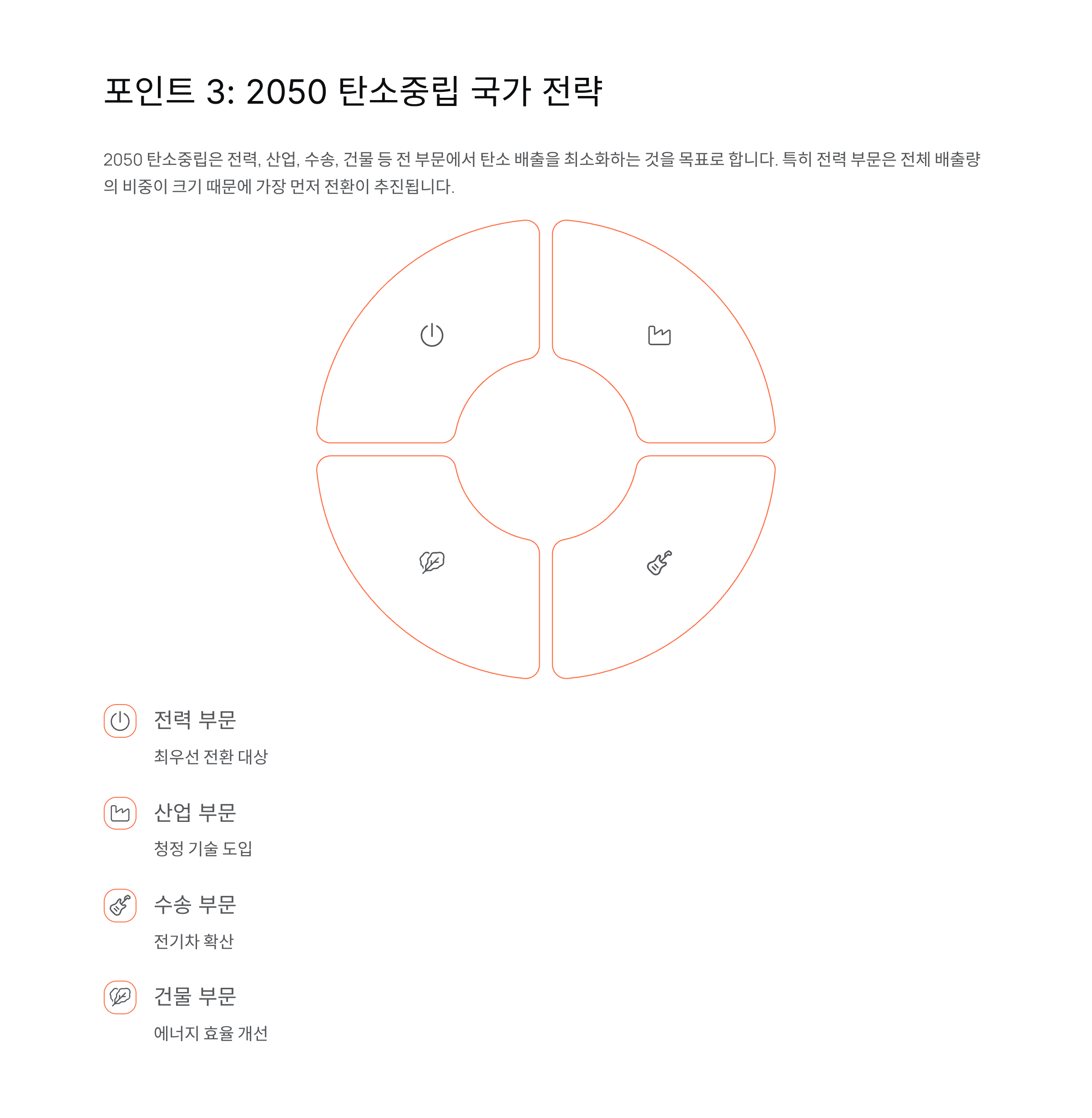2050 탄소중립은 전력, 산업, 수송, 건물 등 전 부문에서 탄소 배출을 최소화하는 것을 목표로 합니다. 특히 전력 부문은 전체 배출량의 비중이 크기 때문에 가장 먼저 전환이 추진됩니다.