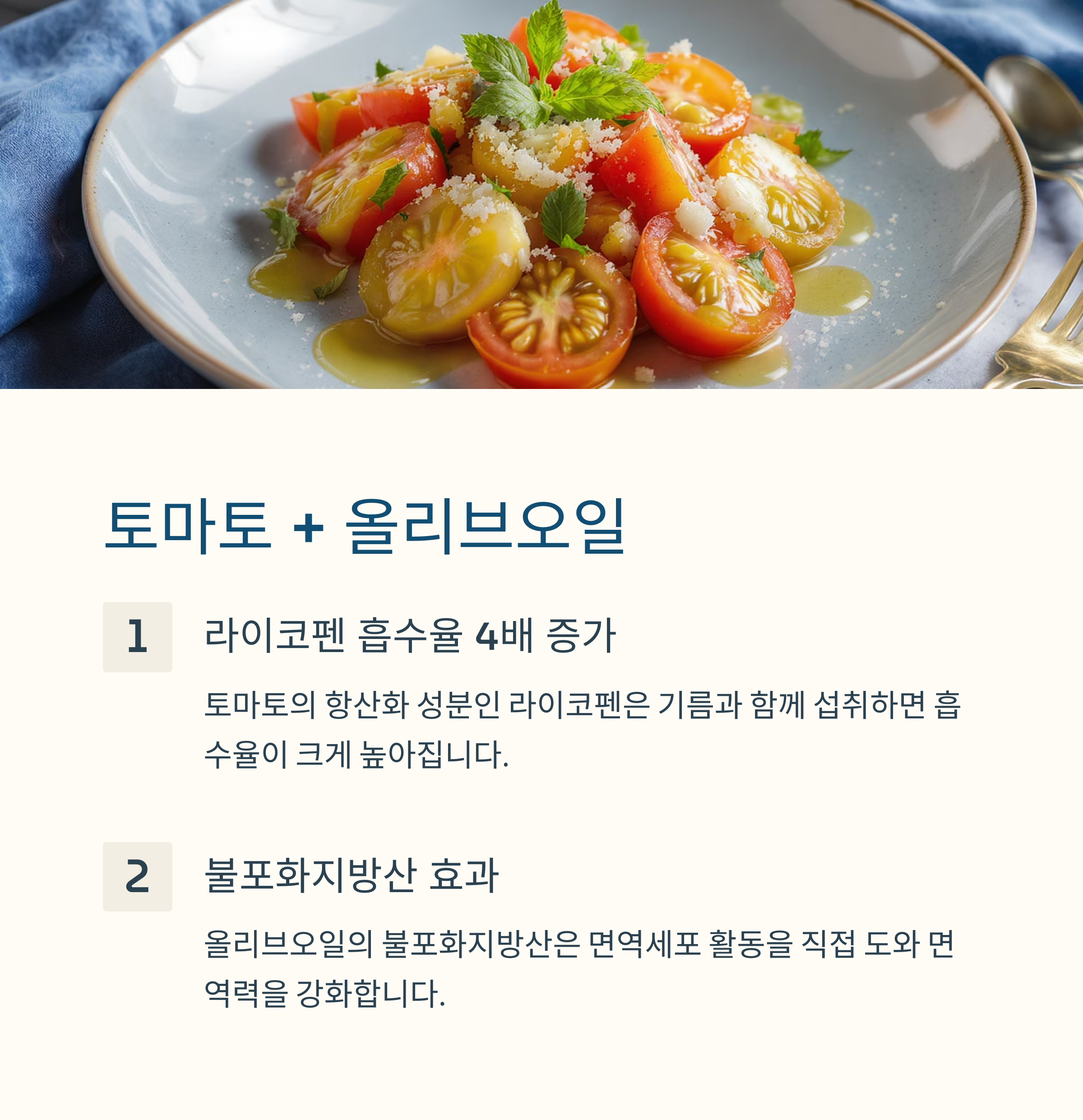 토마토 + 올리브오일 | 라이코펜 흡수율 증가, 항산화 강화 |