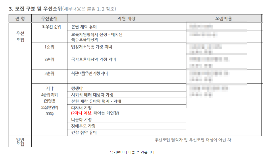 우선모집은 법정 저소득층 국가보훈대상자 북한이탈주민 등이 해당합니다. 시도와 유치원별로 형제자매 재원과 다자녀 등 추가 기준이 있을 수 있습니다. 우선모집 불합격 시 일반모집에 다시 지원이 가능합니다. 일반모집은 연령 요건을 충족한 아동이면 누구나 지원할 수 있습니다. 모든 전형은 추첨이며 선착순이 아닙니다.