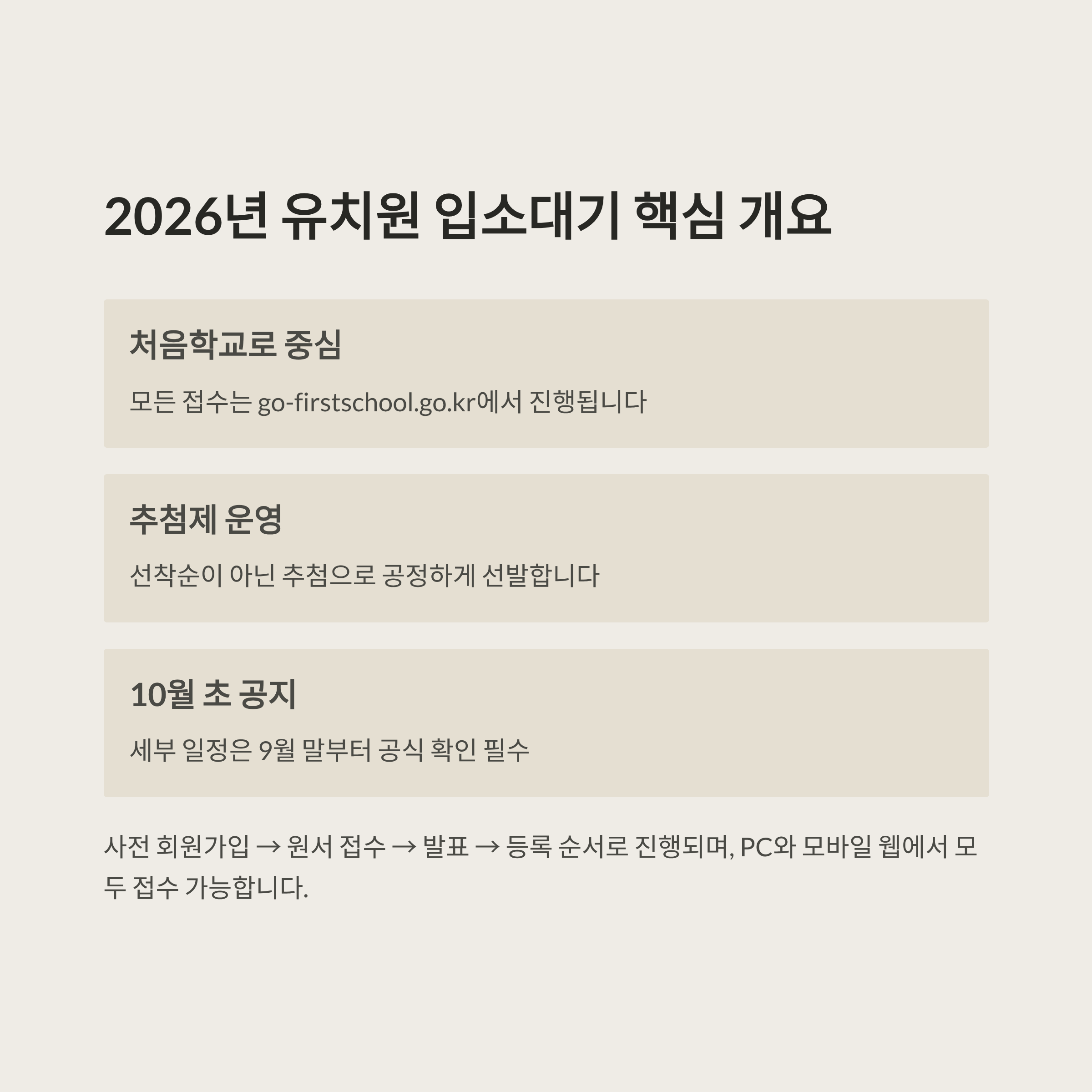 2026학년도 유치원 입소대기는 처음학교로 중심으로 진행됩니다. 모든 접수는 선착순이 아니라 추첨으로 이뤄집니다. 사전 회원가입과 원서 접수 그리고 발표 등록의 순서로 운영됩니다. 2026학년도 세부 일정은 통상 10월 초 공지됩니다.그러므로 9월 말부터 공식 공지 확인이 필수입니다.