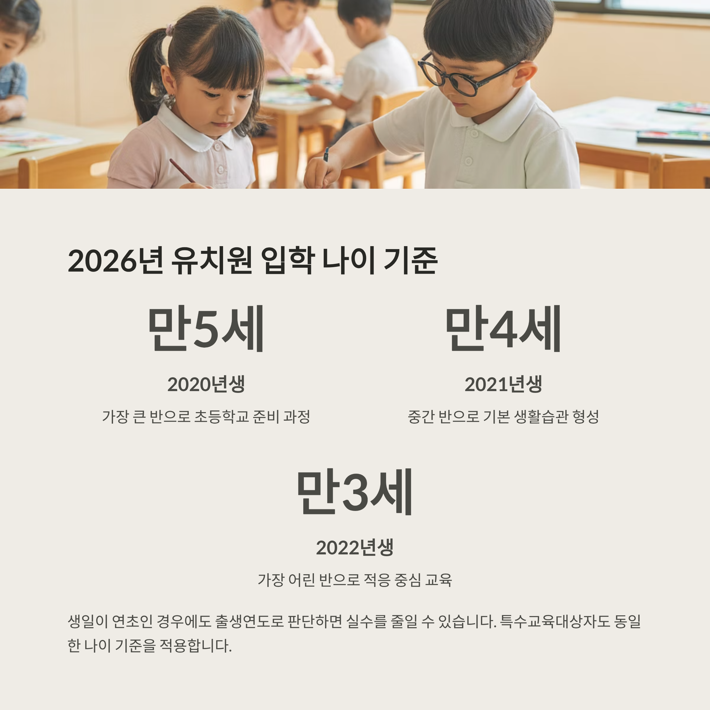 유치원 반 편성은 만 나이를 기준으로 운영됩니다. 2026학년도 기준으로 만 5세반은 2020년생입니다. 만 4세반은 2021년생이며 만 3세반은 2022년생입니다. 생일이 연초인 경우에도 출생연도로 판단하면 실수가 줄어듭니다. 특수교육대상자 공고에서 동일 범위를 재확인할 수 있습니다.