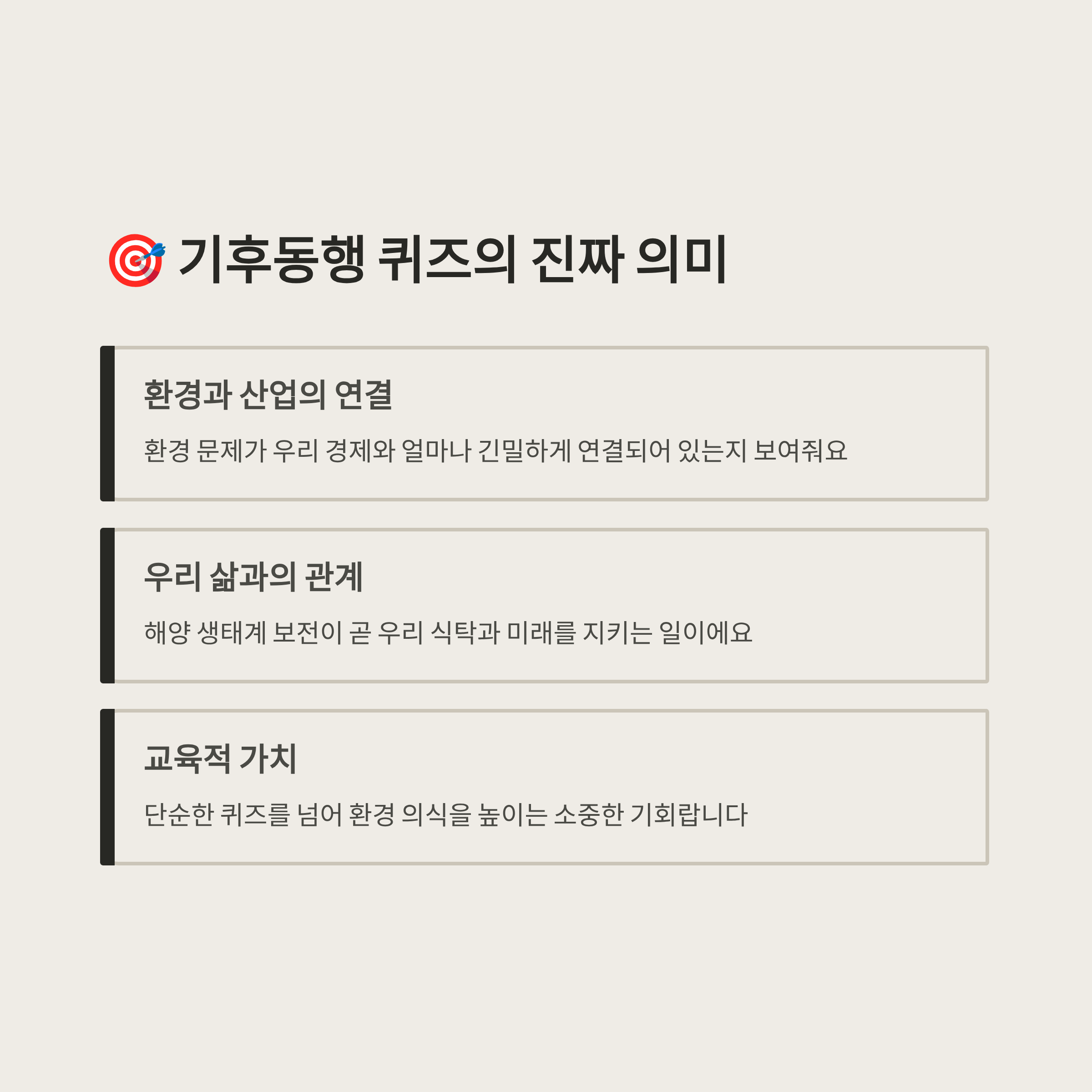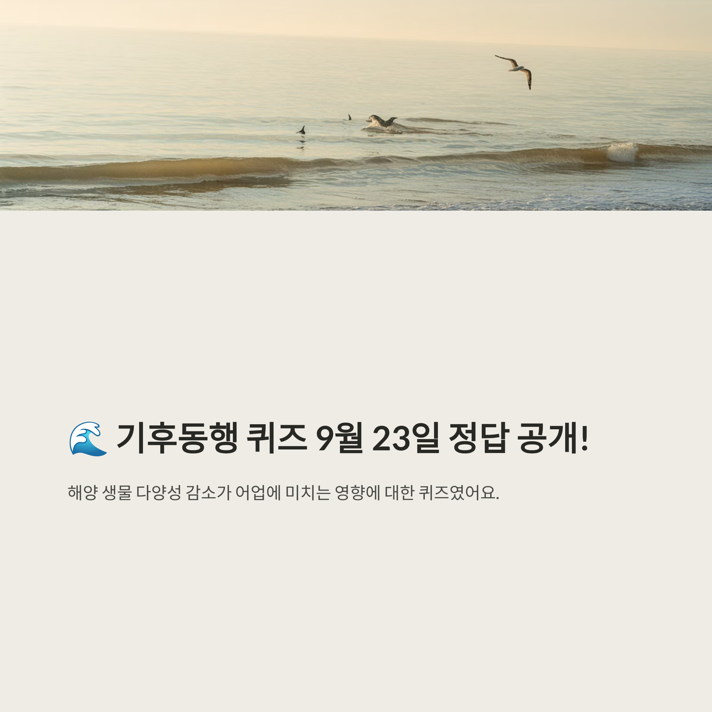 이번 퀴즈는 단순한 정답 풀이를 넘어, 환경과 산업이 얼마나 긴밀히 연결되어 있는지를 보여줍니다. 해양 생태계 보전은 곧 우리의 식탁, 경제, 그리고 미래 세대의 삶을 지키는 일이라는 점을 다시 한 번 강조합니다.