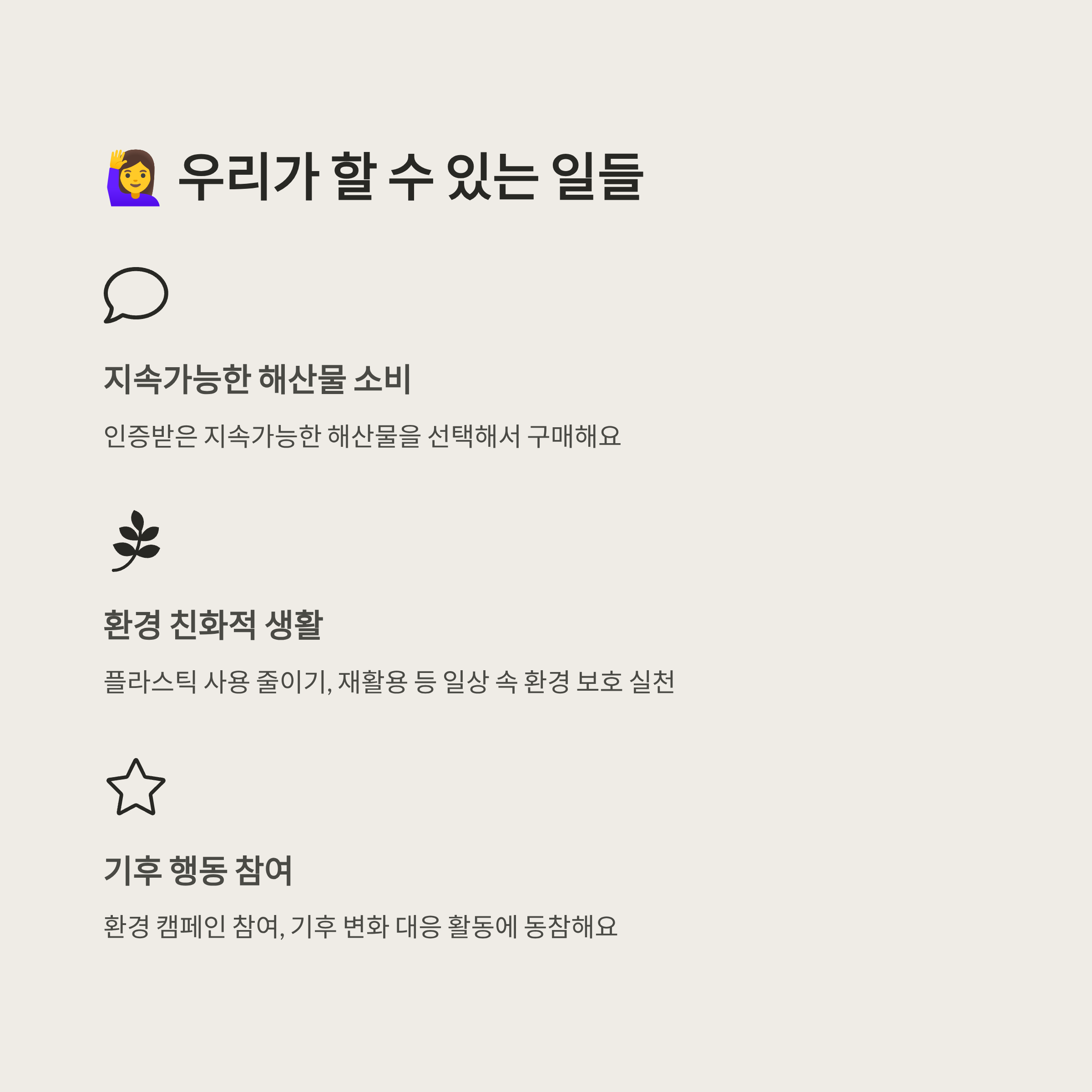 개인 또한 지속 가능한 해산물 소비, 환경 친화적 생활 습관, 기후 행동 참여 등을 통해 해양 생물 보전에 기여할 수 있습니다. 작은 행동이 모이면 더 큰 변화를 이끌어낼 수 있습니다.