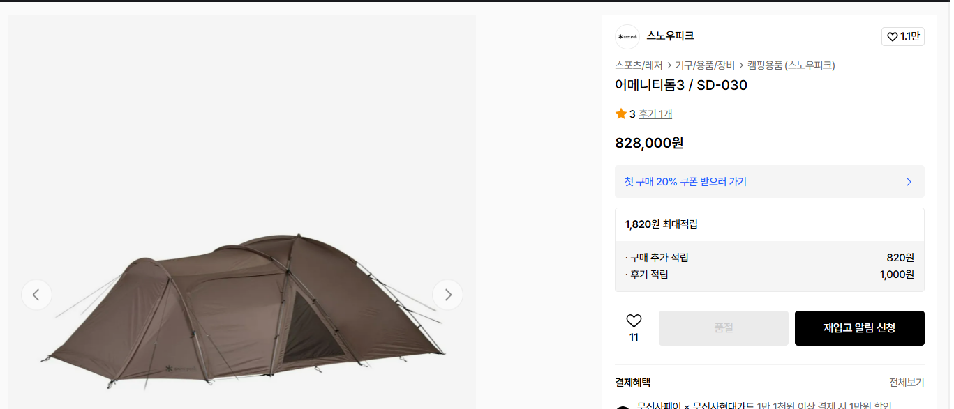상품 이름은 스노우피크 어메니티돔 3입니다. 영문 대소문자 입력이 요구되지 않으며 한글 표기 기준으로 맞추는 것이 안전합니다. 띄어쓰기 또는 특수기호를 임의로 추가하지 말고 화면 이미지의 표기대로 입력하는 것이 좋습니다.