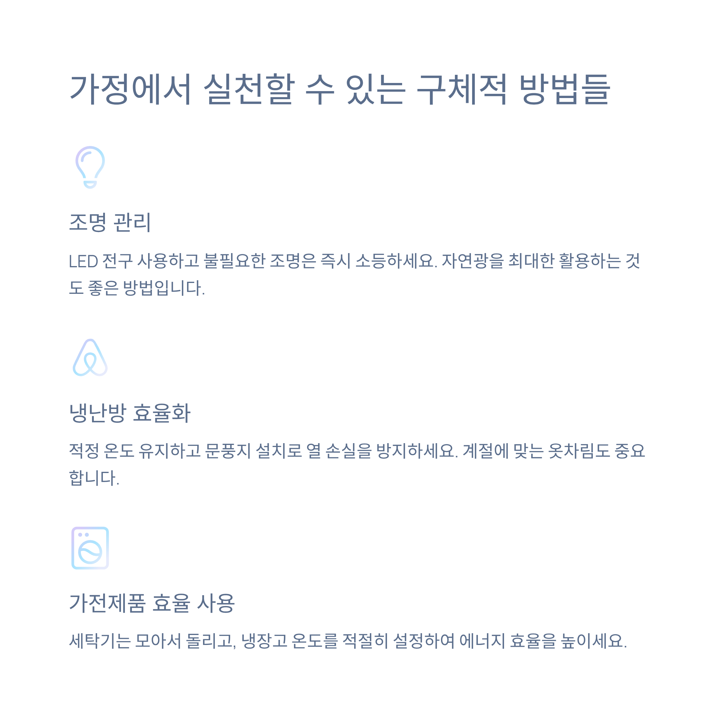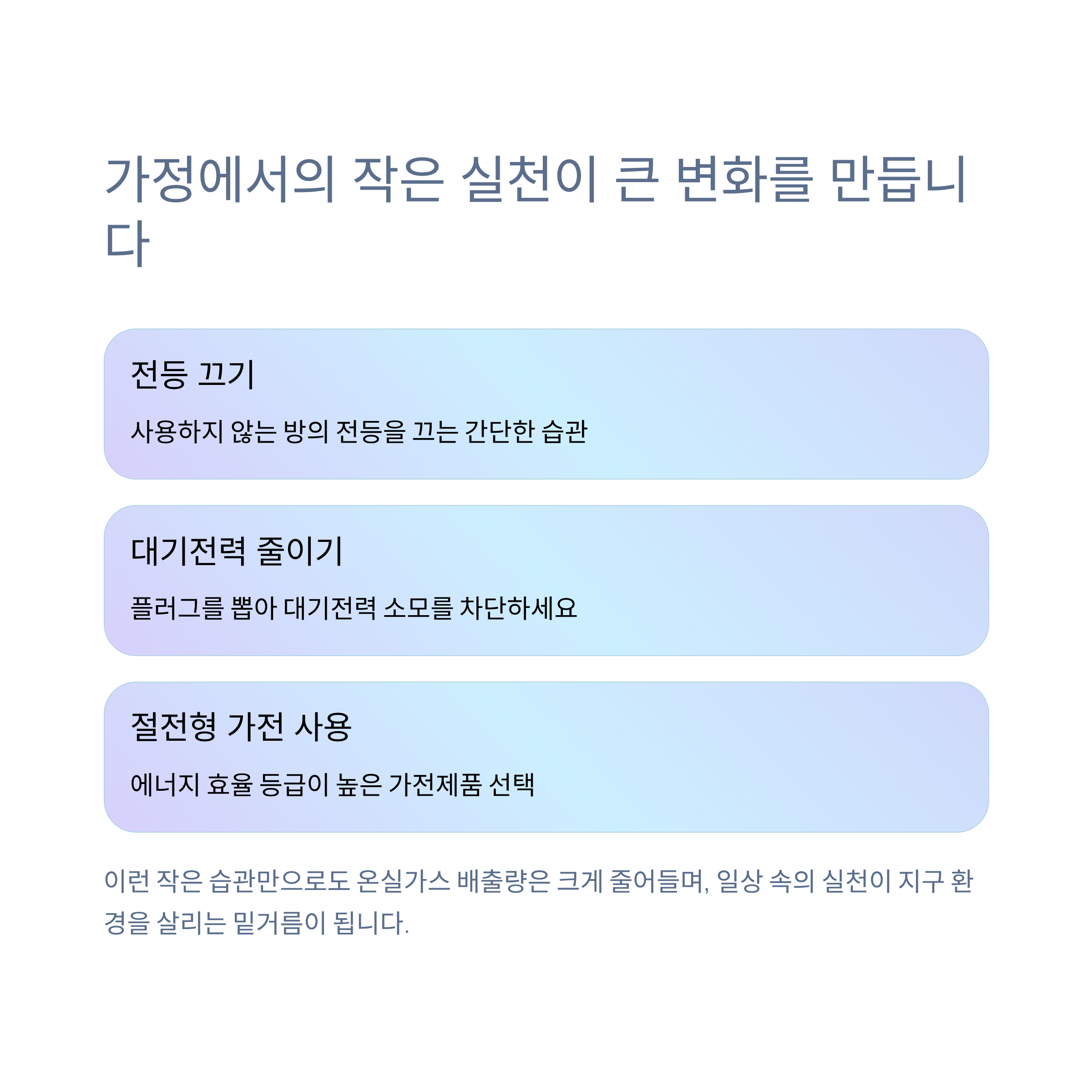 전등을 끄고, 대기전력을 줄이며, 절전형 가전을 사용하는 것만으로도 온실가스 배출량은 크게 줄어듭니다. 일상 속의 작은 습관이 지구 환경을 살리는 밑거름이 됩니다.