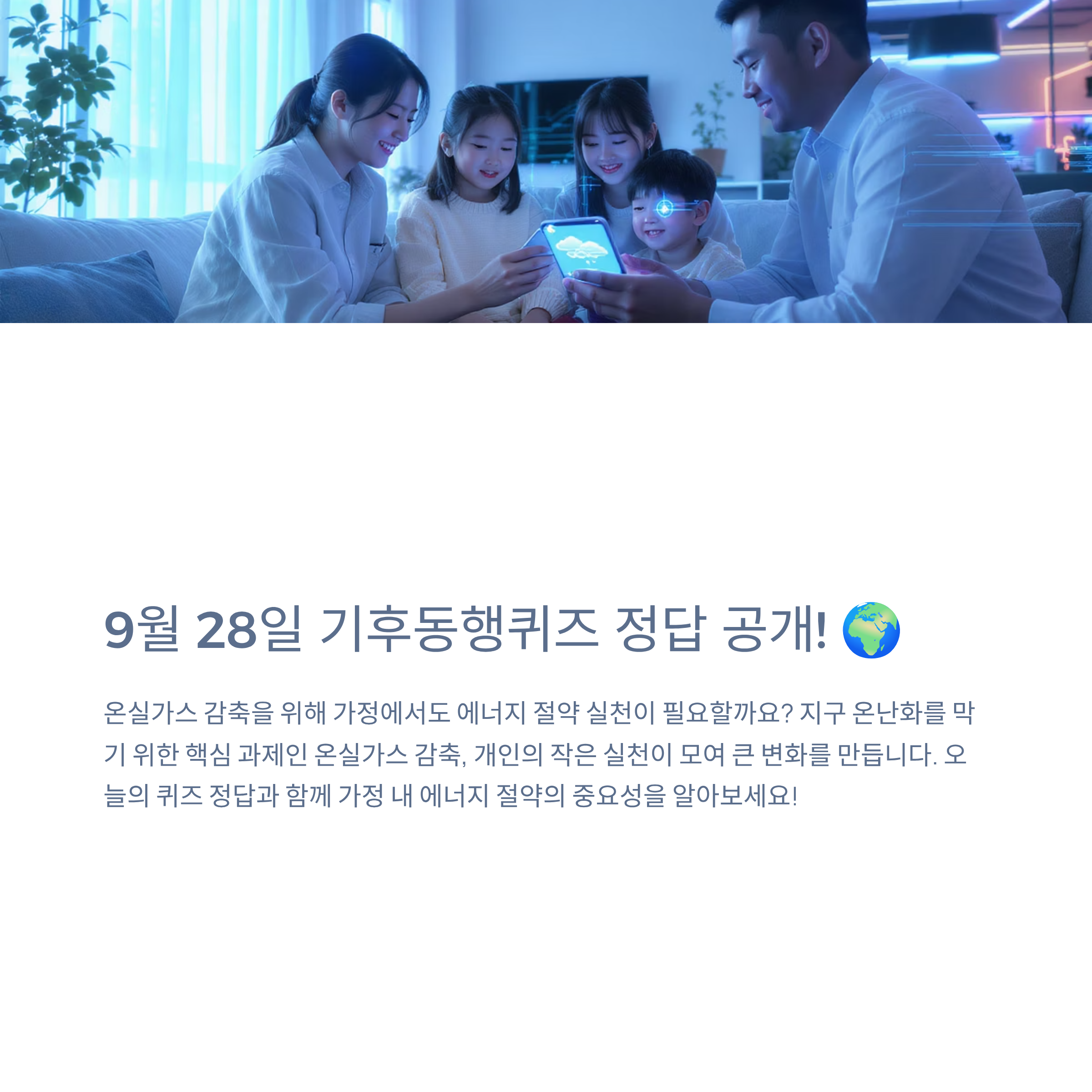 오늘, 9월 28일 일요일 기후동행퀴즈의 정답은 ‘그렇다’입니다. 가정에서도 에너지 절약을 실천하는 것은 온실가스 감축에 필수적인 요소입니다.