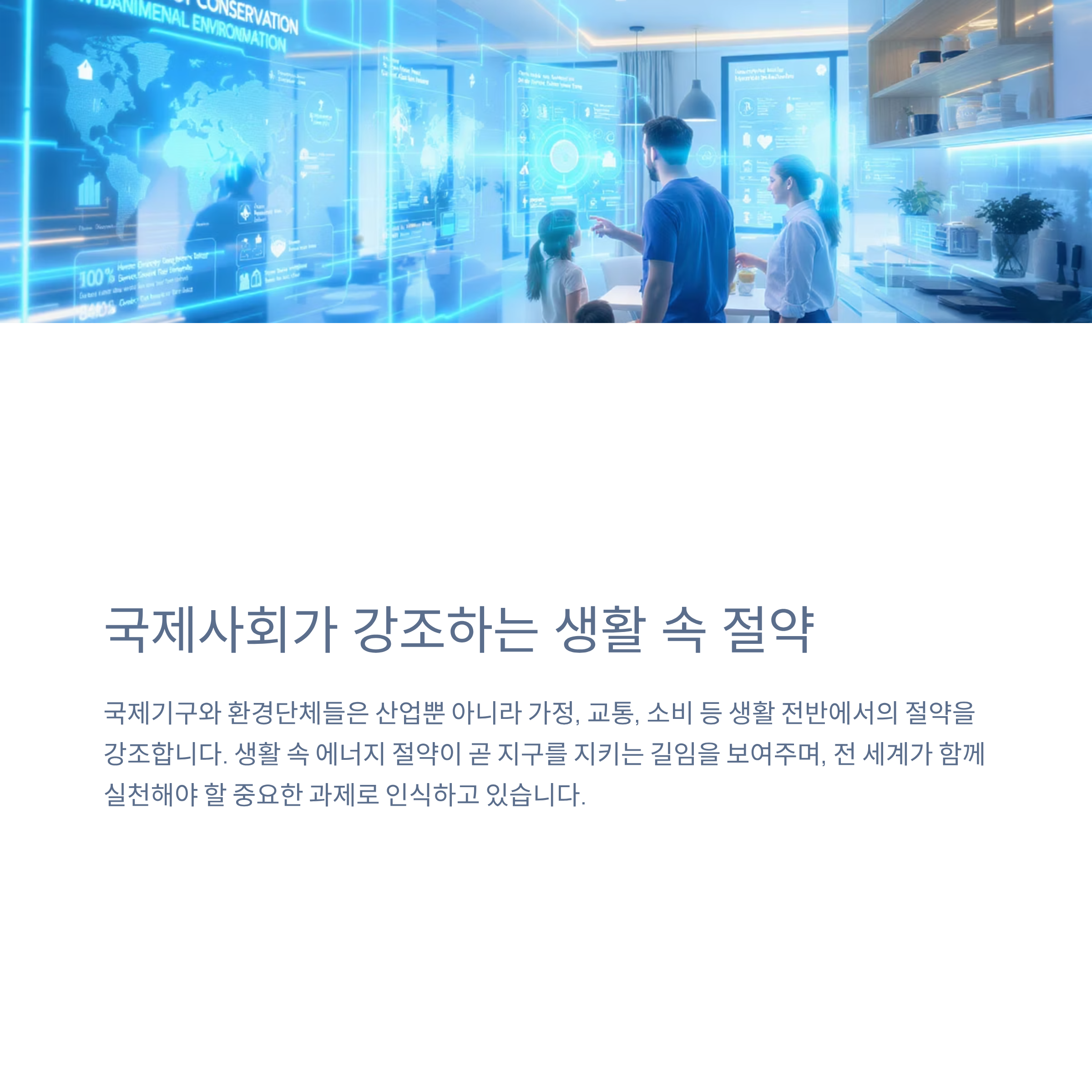 국제기구와 환경단체들은 산업뿐 아니라 가정, 교통, 소비 등 생활 전반에서의 절약을 강조합니다. 생활 속 에너지 절약이 곧 지구를 지키는 길임을 보여줍니다.
