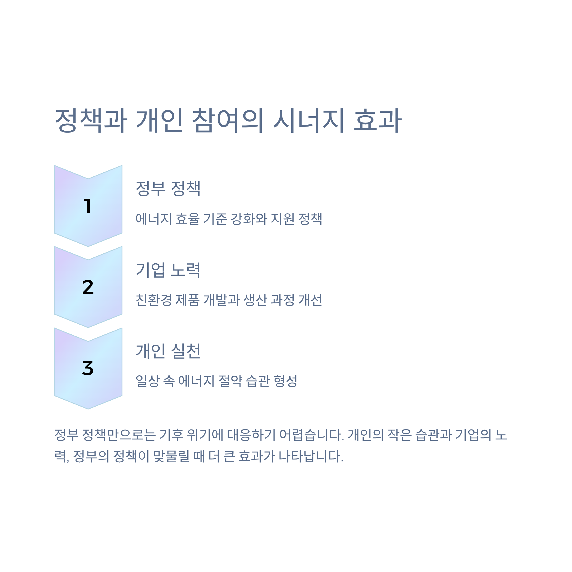 정부 정책만으로는 기후 위기에 대응하기 어렵습니다. 개인의 작은 습관과 기업의 노력, 정부의 정책이 맞물릴 때 더 큰 효과가 나타납니다.