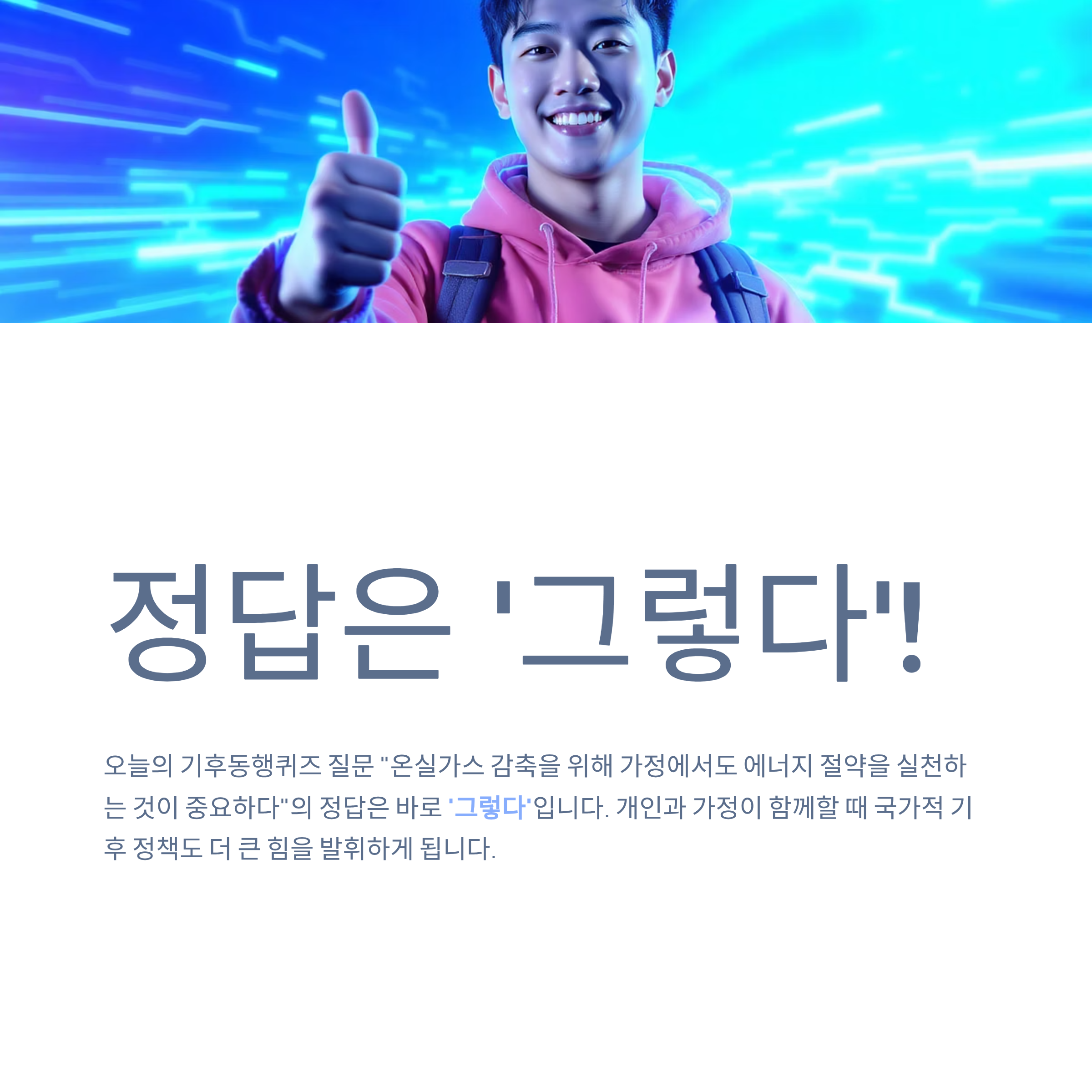 오늘의 퀴즈 질문은 “온실가스 감축을 위해 가정에서도 에너지 절약을 실천하는 것이 중요하다”입니다. 이 질문의 정답은 바로 ‘그렇다’입니다. 개인과 가정이 함께할 때 국가적 기후 정책도 더 큰 힘을 발휘하게 됩니다.