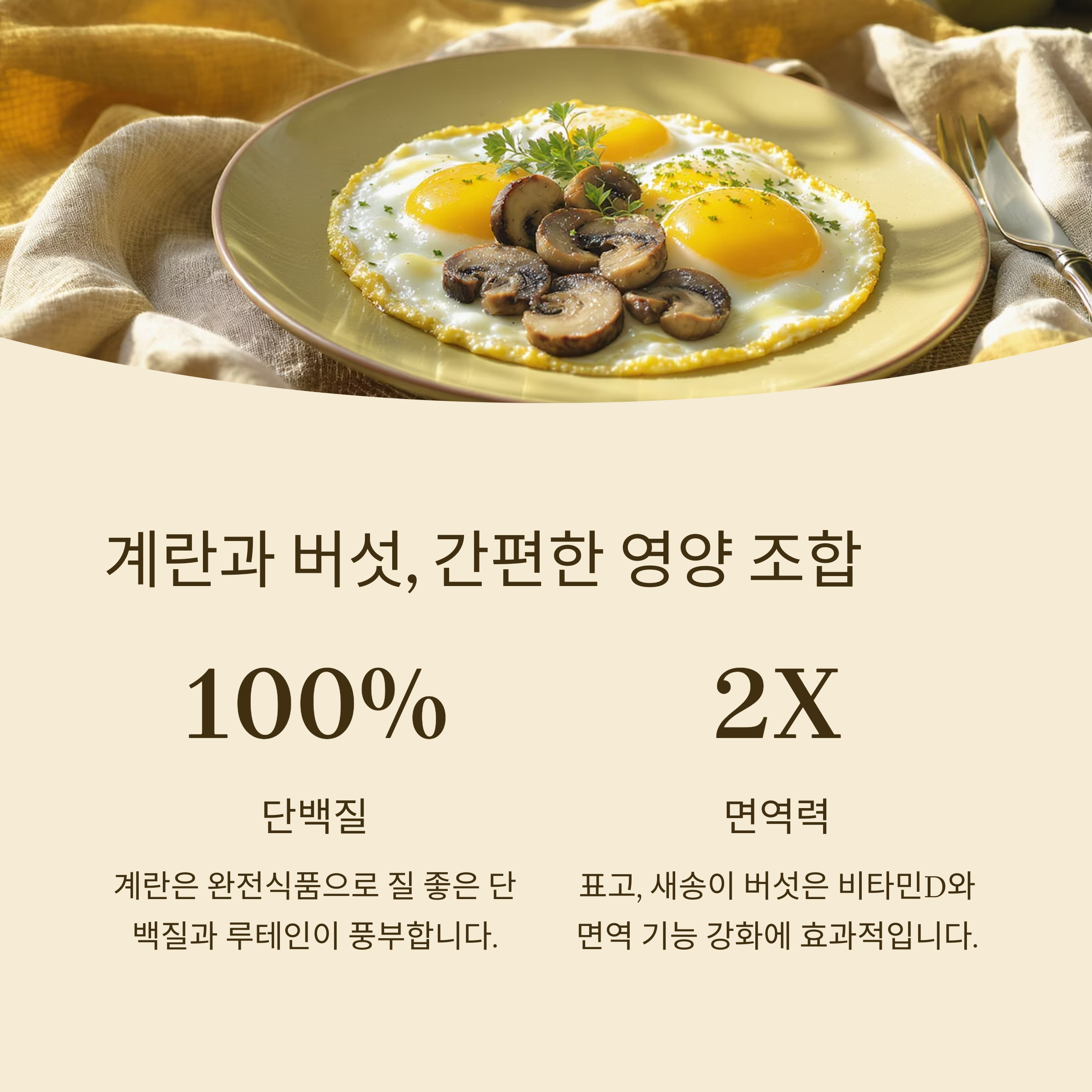 아침 식사로 계란프라이와 버섯 볶음을 추천드립니다.