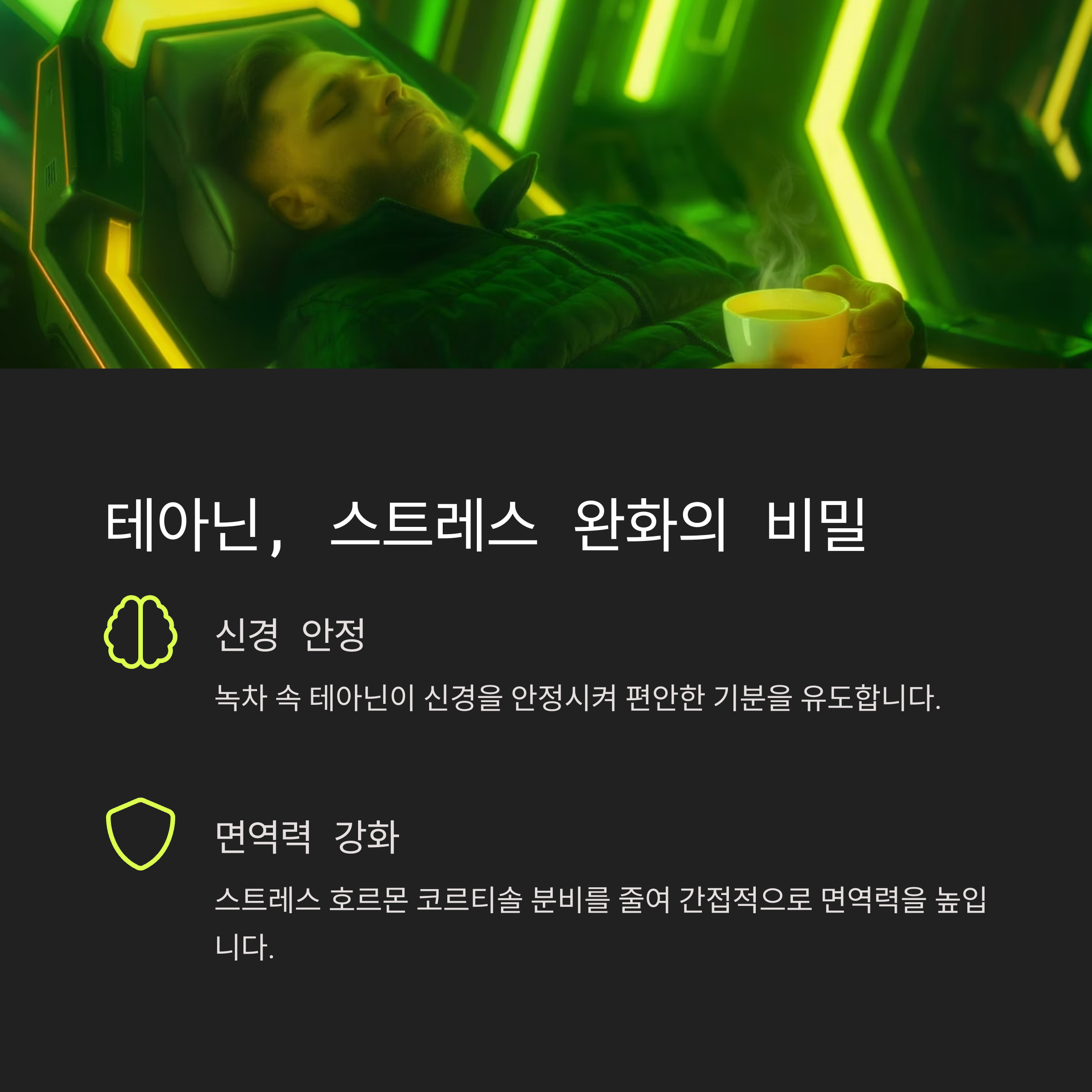 녹차 속 테아닌은 신경을 안정시켜 주는 역할을 합니다.