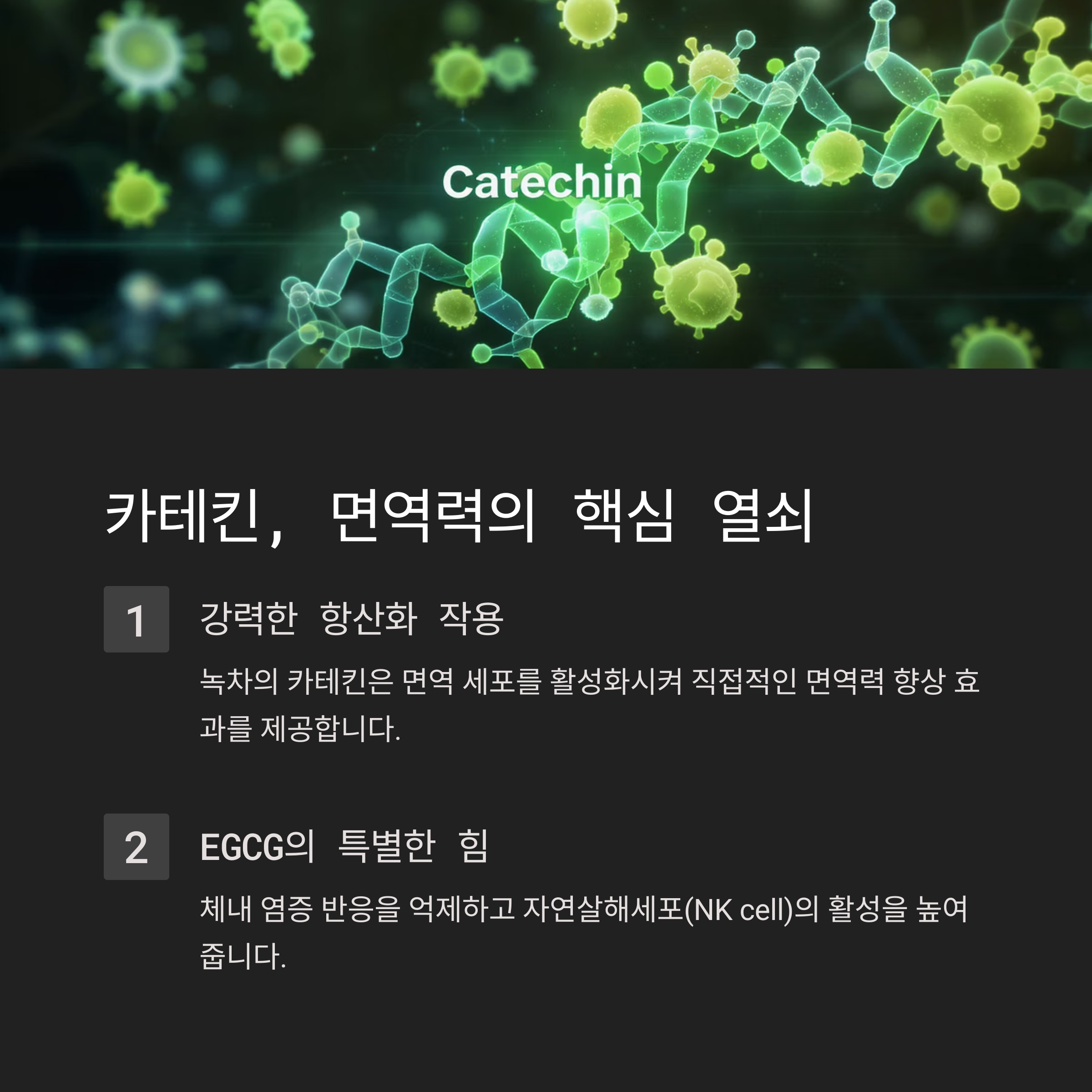녹차에 풍부한 카테킨은 강력한 항산화 작용으로 잘 알려져 있습니다.