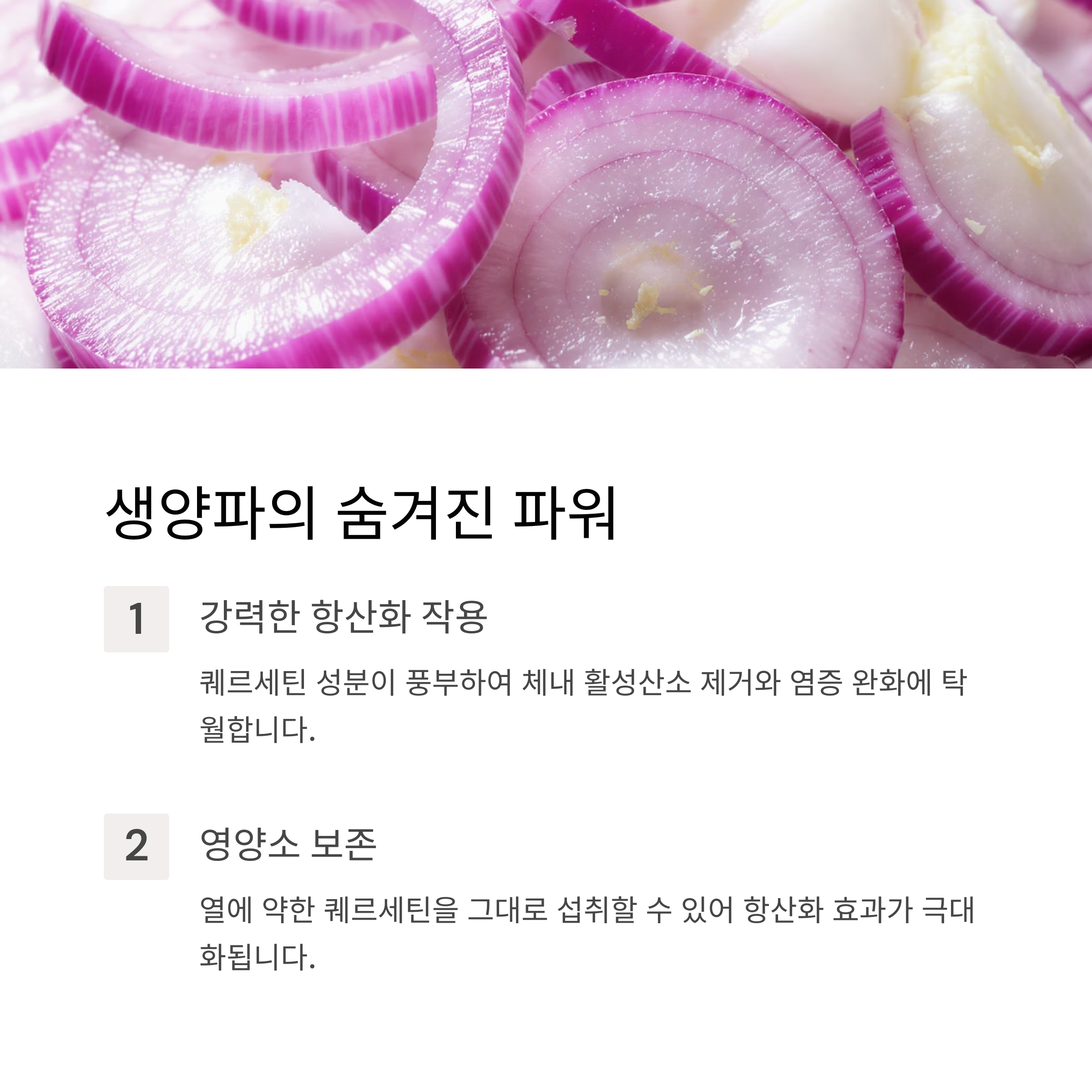 생양파에는 퀘르세틴이라는 강력한 항산화 성분이 풍부하게 들어 있습니다.
