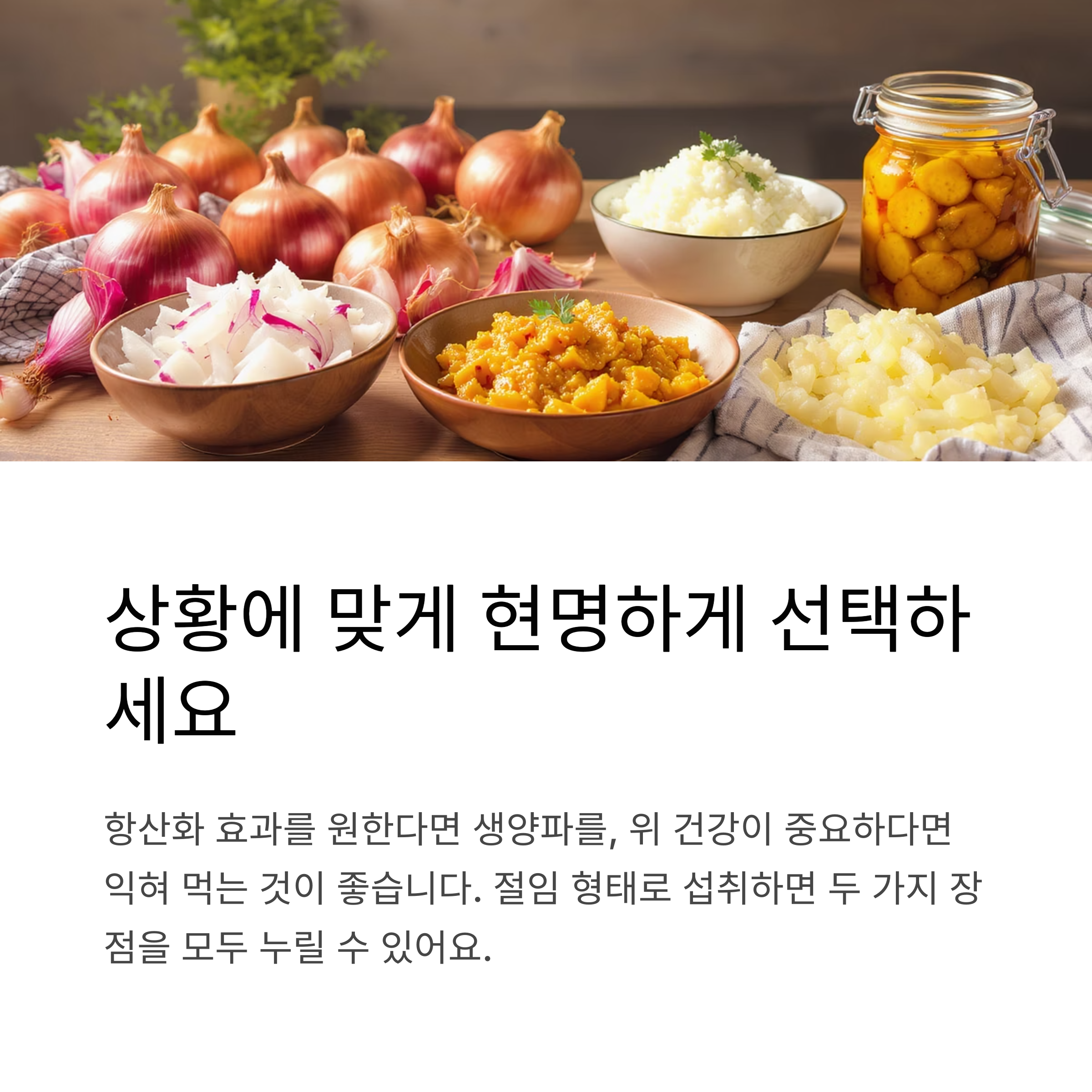 항산화 효과를 원한다면 생양파를, 위 건강이 중요하다면 익혀 먹는 것을 추천드립니다.