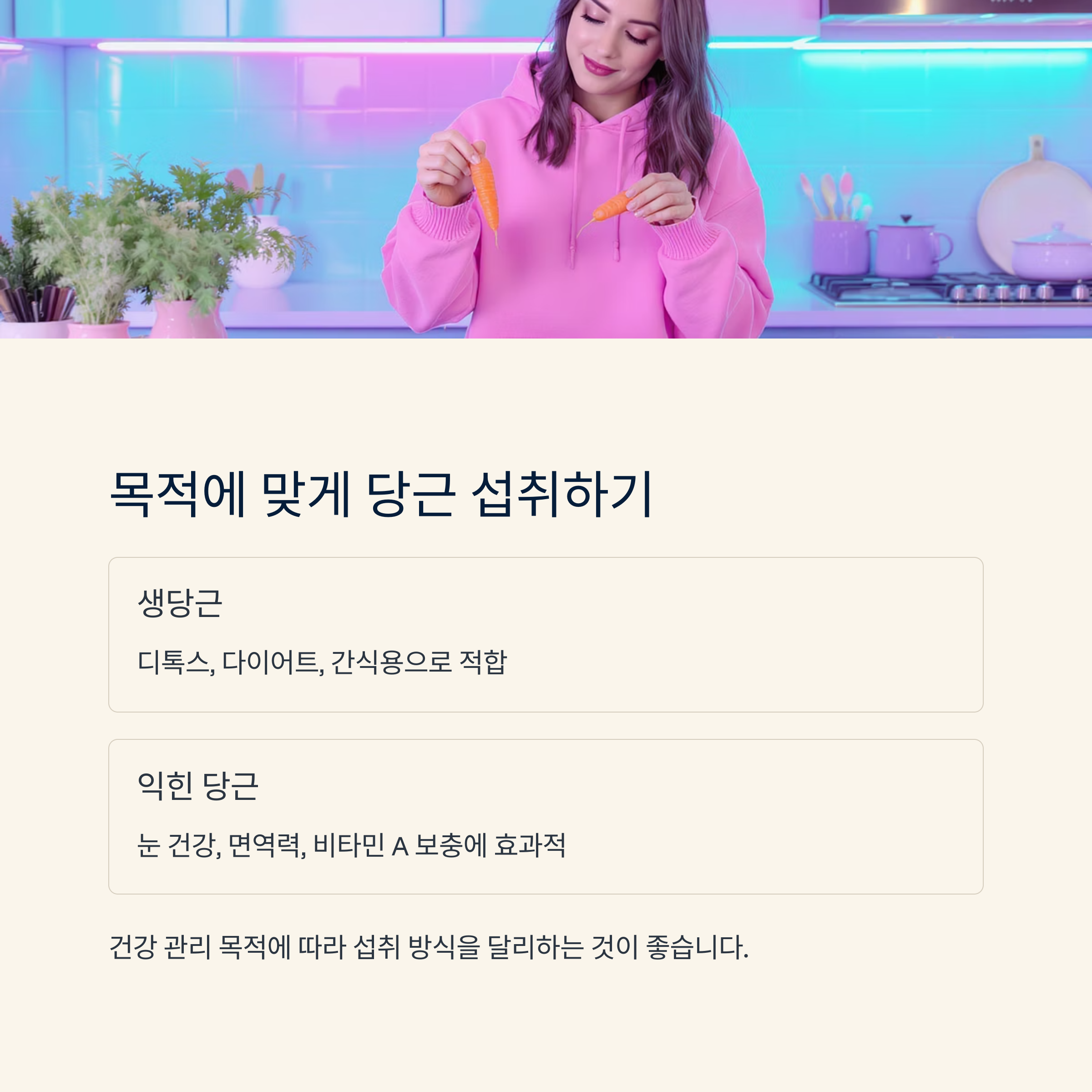 당근에 풍부한 베타카로틴은 체내에서 비타민 A로 전환되며 눈 건강과 면역력에 도움을 줍니다.
