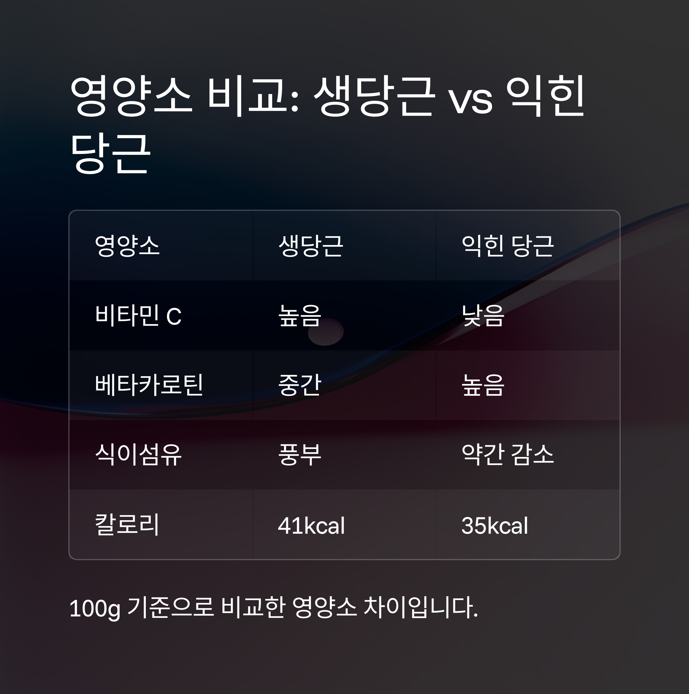 다음 표는 생당근과 익힌 당근의 주요 영양소 차이를 요약한 것입니다.