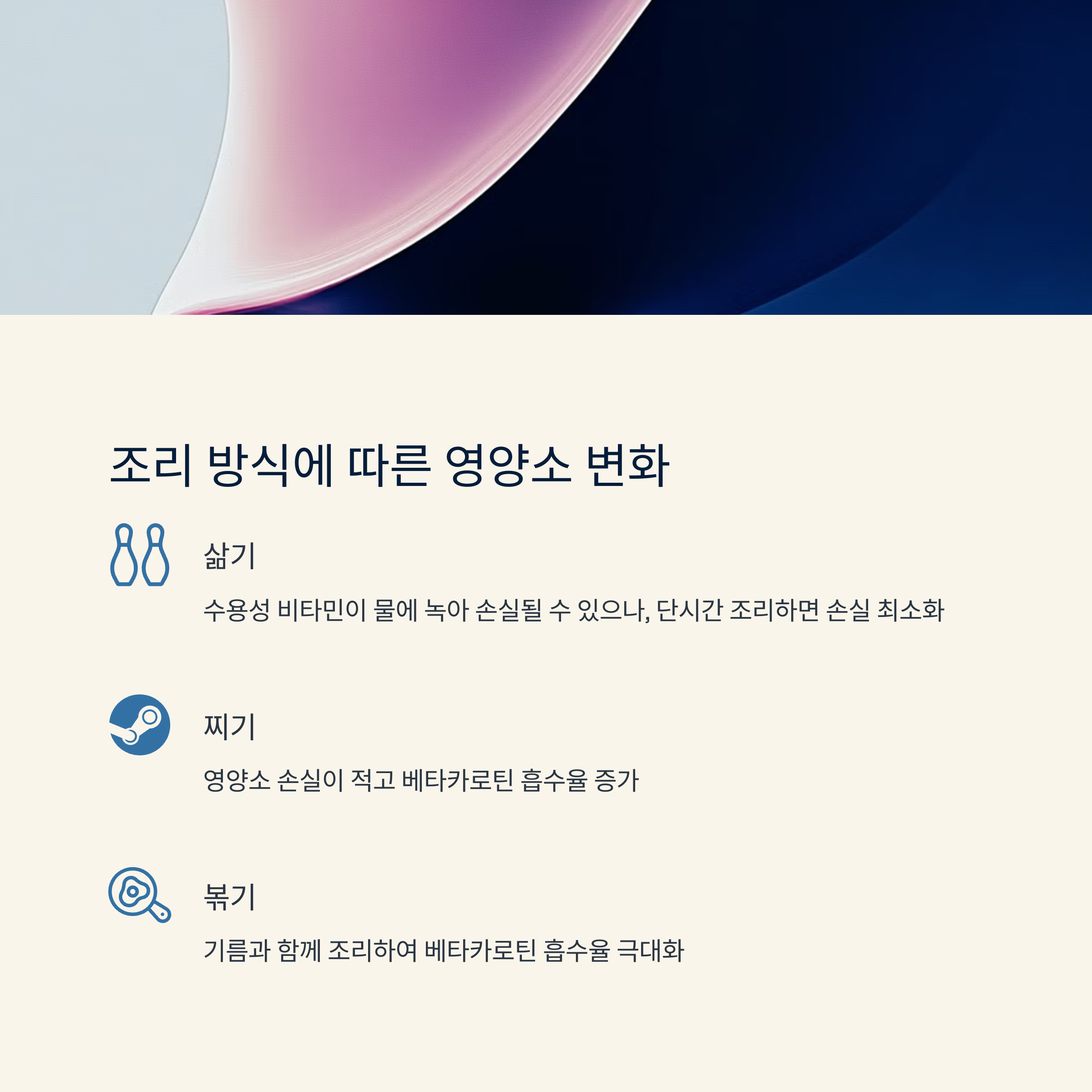 하지만 단시간 익히거나 찌면 손실을 줄일 수 있으며, 베타카로틴은 오히려 증가합니다.